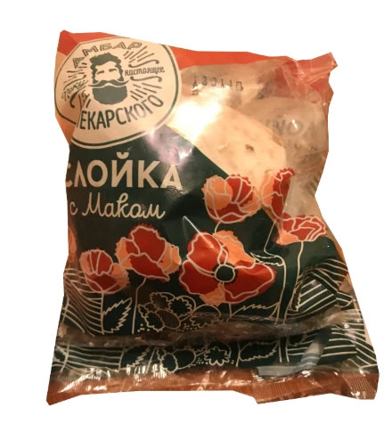 Аппетитное хлебобулочное изделие с маком. Верх слойки полит нежным и тонким слоем белой глазури. Слойку можно немного разогреть в микроволновке перед подачей к столу - тогда она станет еще вкуснее.