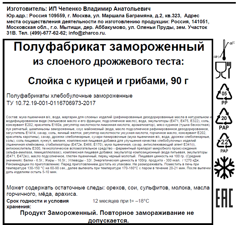 Мука пшеничная хлебопекарная высший сорт, маргарин для слоения, молоко сухое, соль пищевая, антиокислитель Е392; филе грудки, лук репчатый, грибы замороженные, масло растительное нарафенированное дезодорированное, вода питьевая, сахар, соль, загустители Е1422, Е1450, консерванты, стабилизаторы Е412, Е415.