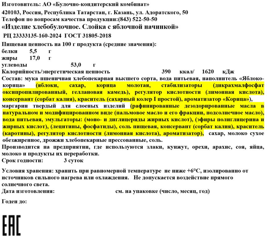 Мука пшеничная хлебопекарная высшего сорта, вода питьевая, наполнитель Яблоко-корица (яблоки, сахар, корица молотая, стабилизаторы (дикрахмалфосфат оксипропилированный, геллановая камедь), регулятор кислотности (лимонная кислота), консервант (сорбат калия), краситель (сахарный колер I простой), ароматизатор Корица), маргарин твердый для слоеных изделий (рафинированные дезодорированные масла в натуральном и модифицированном виде (пальмовое масло и его фракции), подсолнечное масло, вода питьевая, эмульгаторы: (моно- и диглицериды жирных кислот), (эфиры полиглицерина и жирных кислот), (лецитины, фосфатиды), соль пищевая, консервант (сорбат калия), краситель (каротины), регулятор кислотности (лимонная кислота), ароматизатор), сахар, молоко сухое обезжиренное, дрожжи хлебопекарные прессованные, соль.