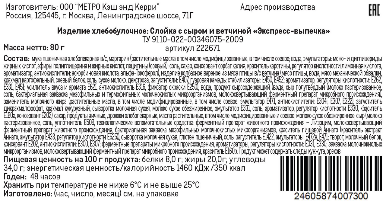 Мука пшеничная хлебопекарная в/с, маргарин (растительные масла в том числе модифицированные, в том числе соевое; вода, эмульгаторы: моно- и диглицериды жирных кислот, эфиры полиглицерина и жирных кислот, лецитины (соевый); соль, сахар, консервант сорбат калия, краситель каротины, регулятор кислотности лимонная кислота, ароматизатор, антиокислители: аскорбиновая кислота, альфа-Токоферол), изделие колбасное вареное из мяса птицы в/с ветчина (мясо птицы, вода, мясо механической обвалки, крахмал картофельный, соевый белок, соль, сухое молоко, декстроза, загустители: Е407, гуаровая камедь; стабилизаторы: Е450, Е452; ароматизатор, регуляторы кислотности: Е262, Е331, Е451; усилитель вкуса и аромата Е621, антиокислитель Е316, фиксатор окраски Е250), вода, продукт сыросодержащий (вода, сыр полутвёрдый (молоко пастеризованное, соль, бактериальная закваска мезофильных и термофильных молочнокислых микроорганизмов, молокосвертывающий ферментный препарат микробного происхождения), заменитель молочного жира (растительные масла, в том числе модифицированные, в том числе соевое; эмульгатор Е471, антиокислители: Е304i, Е307, Е322), загуститель дикрахмалфосфат, крахмал кукурузный, сыворотка молочная сухая, молоко сухое обезжиренное, эмульгатор Е331, соль, ароматизатор, регулятор кислотности Е330, краситель Е160а, консервант Е202), сахар, продукты яичные, дрожжи хлебопекарные, масла растительные, в том числе модифицированные и соевое; молоко сухое обезжиренное, сыр (молоко пастеризованное, соль, уплотнитель Е509, технологические вспомогательные средства: ферментный препарат животного происхождения – Лизоцим, молокосвертывающий ферментный препарат животного происхождения, бактериальная закваска мезофильных молочнокислых микроорганизмов, краситель пищевой Аннато (краситель экстракт Аннато, эмульгатор Е433, регулятор кислотности Е525)), сыворотка молочная сухая, глютен пшеничный, соль, загуститель Е1422, эмульгаторы: Е472e, Е471; творог, молочный белок, консервант Е202, антиокислители: Е300, Е307; ферментные препараты микробного происхождения, ароматизаторы, регуляторы кислотности: Е331, Е330; закваска молочнокислых микроорганизмов, молокосвертывающий ферментный препарат микробного происхождения, краситель Е160b. Продукт может содержать следы кунжута, орехов.