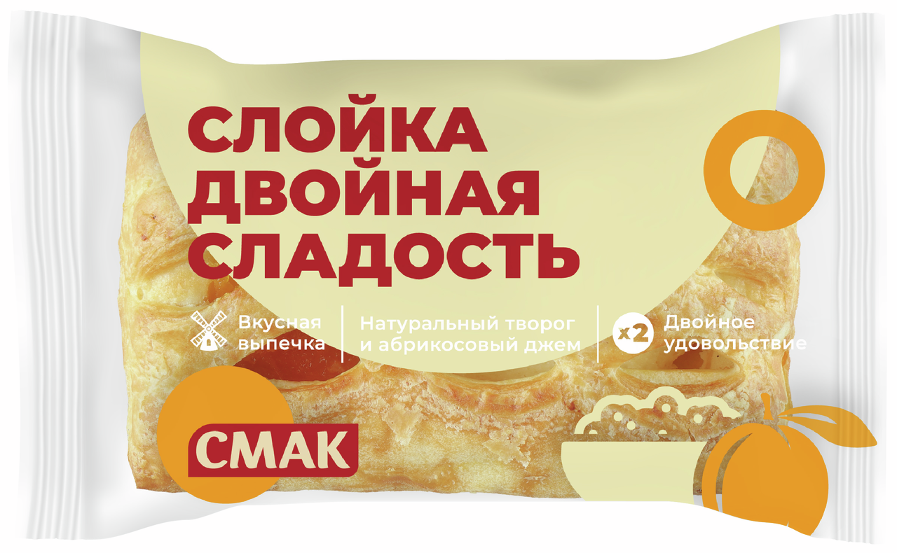 Слойка Двойная сладость с творогом и абрикосом. В слойке сразу две начинки: натуральный творог и абрикосовый конфитюр. Можно использовать в качестве перекуса или как десерт с чаем.