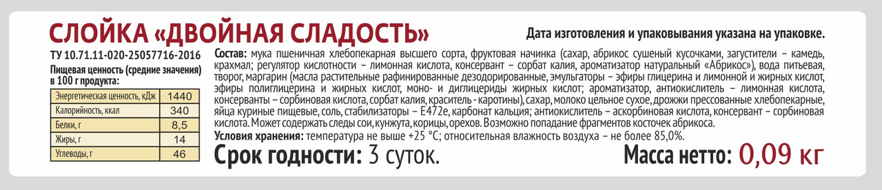 Мука пшеничная хлебопекарная высшего сорта, фруктовая начинка (сахар, абрикос сушеный кусочками, загустители – камедь, крахмал; регулятор кислотности – лимонная кислота, консервант – сорбат калия, ароматизатор натуральный Абрикос), вода питьевая, творог, маргарин (масла растительные рафинированные дезодорированные, эмульгаторы – эфиры глицерина и лимонной и жирных кислот, эфиры полиглицерина и жирных кислот, моно- и диглицериды жирных кислот; ароматизатор, антиокислитель - лимонная кислота, консерванты - сорбиновая кислота, сорбат калия, краситель - каротины), сахар, молоко цельное сухое, дрожжи прессованные хлебопекарные, яйца куриные пищевые, соль, стабилизаторы – Е472е, карбонат кальция; антиокислитель – аскорбиновая кислота, консервант – сорбиновая кислота. Может содержать следы сои, кунжута, корицы, орехов. Возможно попадание фрагментов косточек абрикоса.