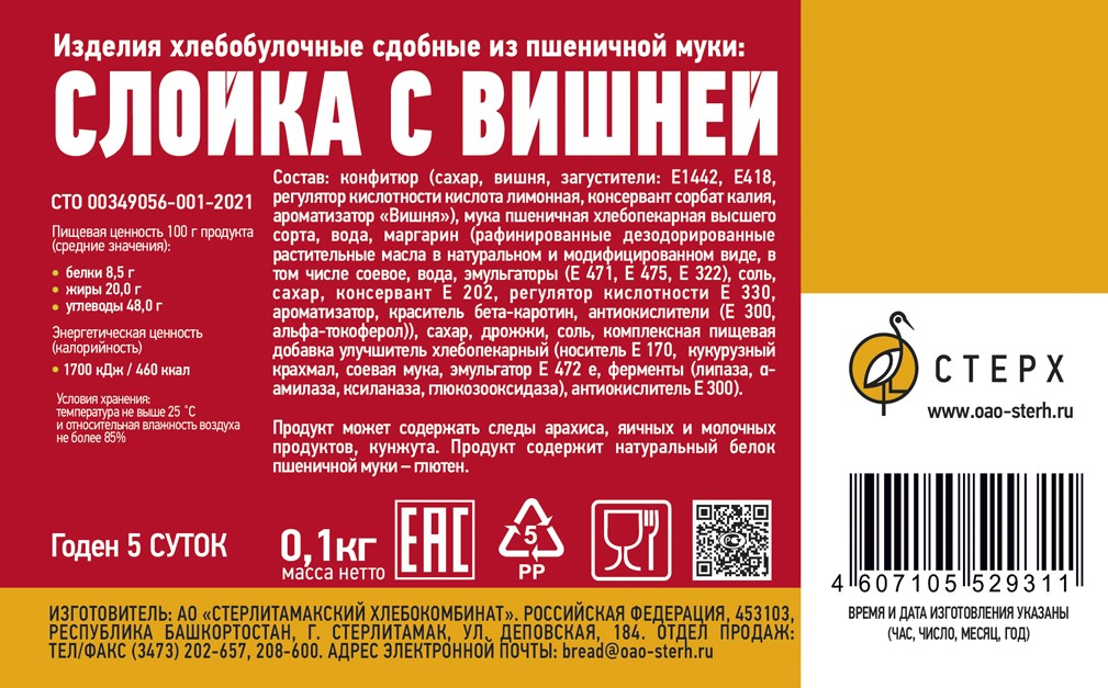 Конфитюр (сахар, вишня, загустители: E1442, E418, регулятор кислотности кислота лимонная, консервант сорбат калия, ароматизатор Вишня), мука пшеничная хлебопекарная высшего сорта, вода, маргарин (рафинированные дезодорированные растительные масла в натуральном и модифицированном виде, в том числе соевое, вода, эмульгаторы (E471, Е 475, Е 322), соль, сахар, консервант Е202, регулятор кислотности E 330, ароматизатор, краситель бета-каротин, антиокислители (Е 300, альфа-токоферол)), сахар, дрожжи, соль, комплексная пищевая добавка улучшитель хлебопекарный (носитель E 170, кукурузный крахмал, соевая мука, эмульгатор Е 472е, ферменты (липаза, а- амилаза, ксиланаза, глюкозооксидаза), антиокислитель E 300).