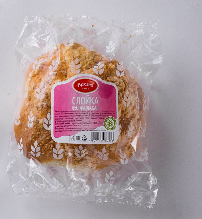 Слойка Ярхлеб Вестфальская, 100г выпечена из невесомого слоеного теста, которое отличается воздушным, рыхлым мякишем и румяной корочкой. Булочка подходит для приятного перекуса. Подается к чаю или кофе с джемом, вареньем. Со слойкой компании Ярхлеб вы окунетесь в детство. Ее любят как взрослые, так и дети.