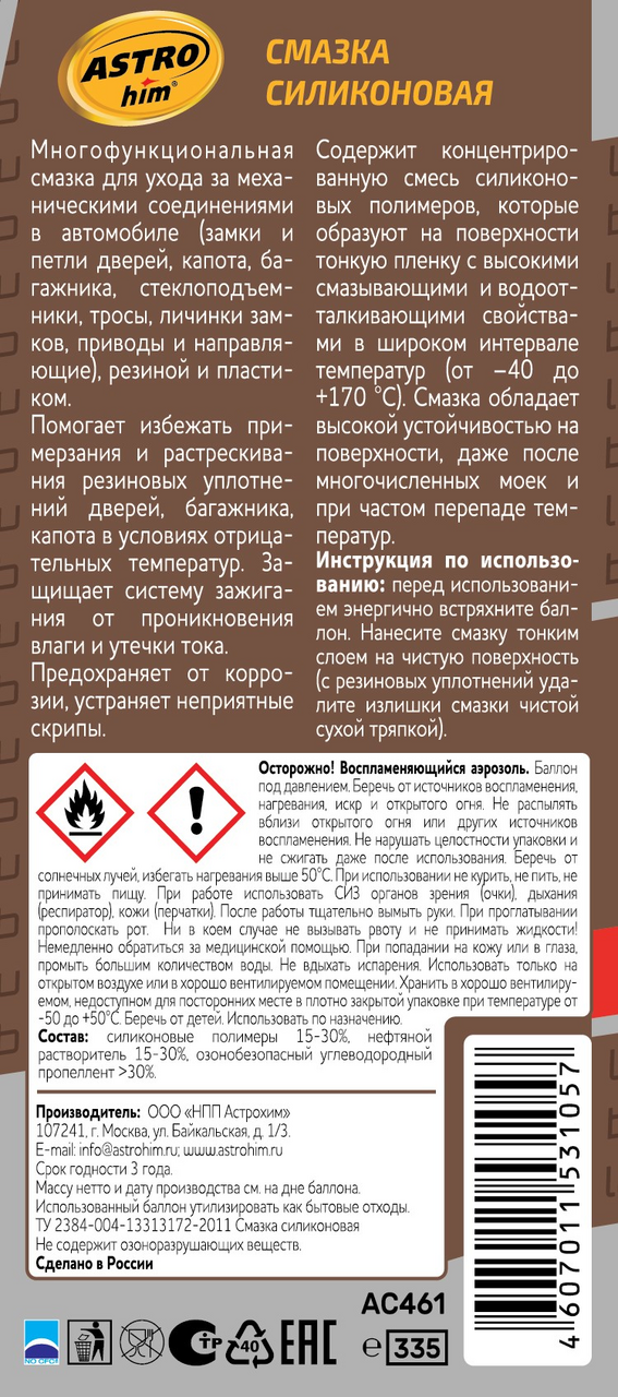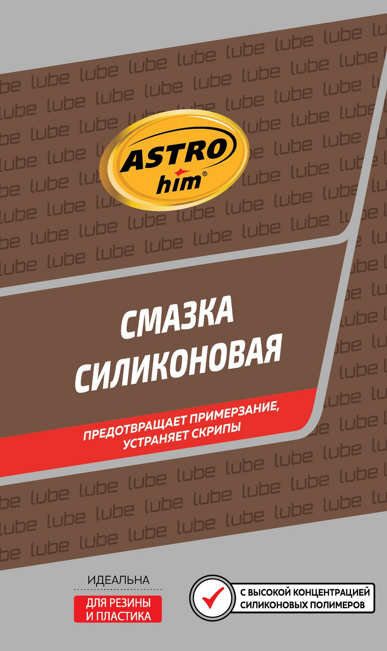 Профессиональная концентрированная смазка для ухода за механическими соединениями в автомобиле (замки и петли дверей, капота, багажника, стеклоподъемники, тросы, личинки замков, приводы и направляющие). Смазка силиконовая Astrohim - незаменимое средство для обслуживания промышленного оборудования. Помогает избежать примерзания и растрескивания резиновых уплотнений дверей, багажника, капота в условиях отрицательных температур. Продлевает срок службы резиновых уплотнителей. Защищает систему зажигания от проникновения влаги и утечки тока. Защищает металлические соединения от коррозии, устраняет неприятные скрипы и прикипание деталей. Профессиональная формула смазки содержит концентрированную смесь силиконовых полимеров, которые образуют на поверхности тонкую пленку с высокими смазывающими и водоотталкивающими свойствами в широком интервале температур (от -40C до +170C). Смазка способна оставаться на поверхности после многочисленных моек и при частом перепаде температур. Не содержит минеральное масло..