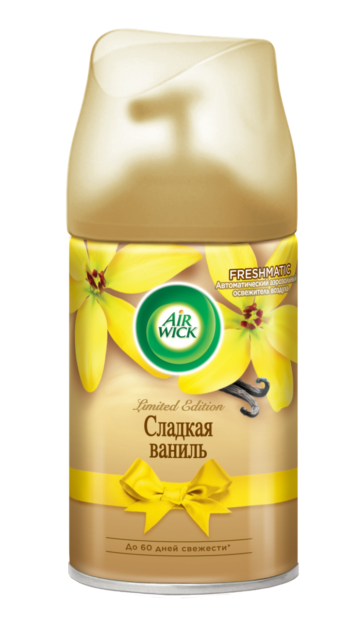 Наполните дом чарующим ароматом ванили в сочетании с пикантными древесными нотками. Вставьте сменный баллон Air Wick "Сладкая ваниль" в элегантное устройство, выберите интенсивность распыления, и Air Wick Freshmatic будет бороться с неприятными запахами* автоматически день за днем. Преимущества автоматического освежителя Air Wick Freshmatic:- До 60 дней свежести**- 1 спрей освежает целую комнату***- Рекомендуется использовать с автоматическим аэрозольным освежителем Air Wick Freshmatic*На основании отчета исследовательского центра Рекитт Бенкизер (Халл, Великобритания) от 23 августа 2018 года в отношении запахов в туалете, на кухне, а также животных.**Эффективен до 60 дней при низком уровне интенсивности аромата и нормальных условиях окружающей среды ***1 спрей освежает помещение объемом 28 м3 согласно данным исследовательского центра Рекитт Бенкизер, отчет №зк-14-04-02 от 27.03.2014 г.