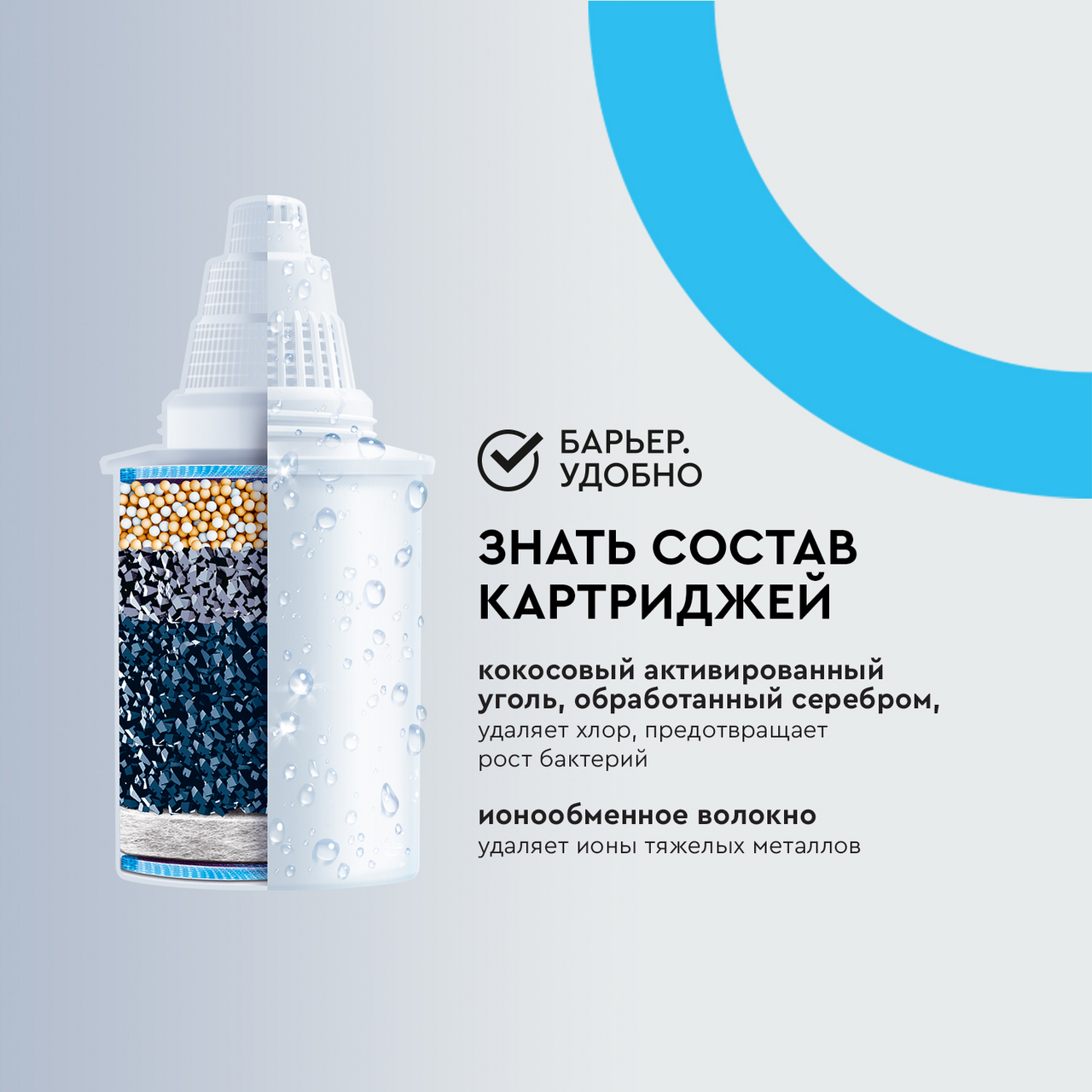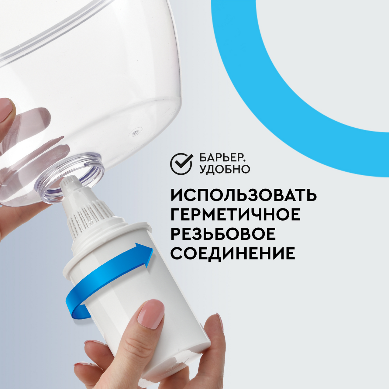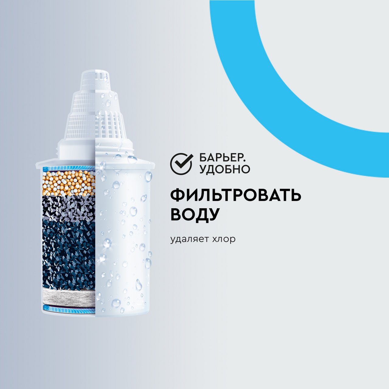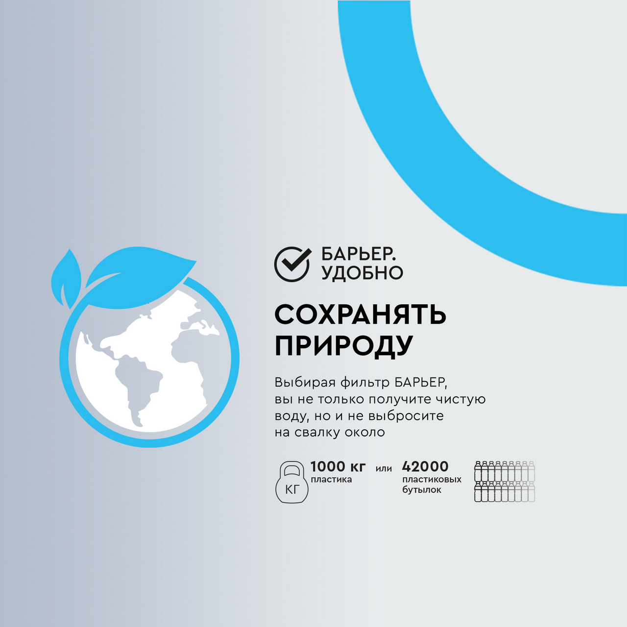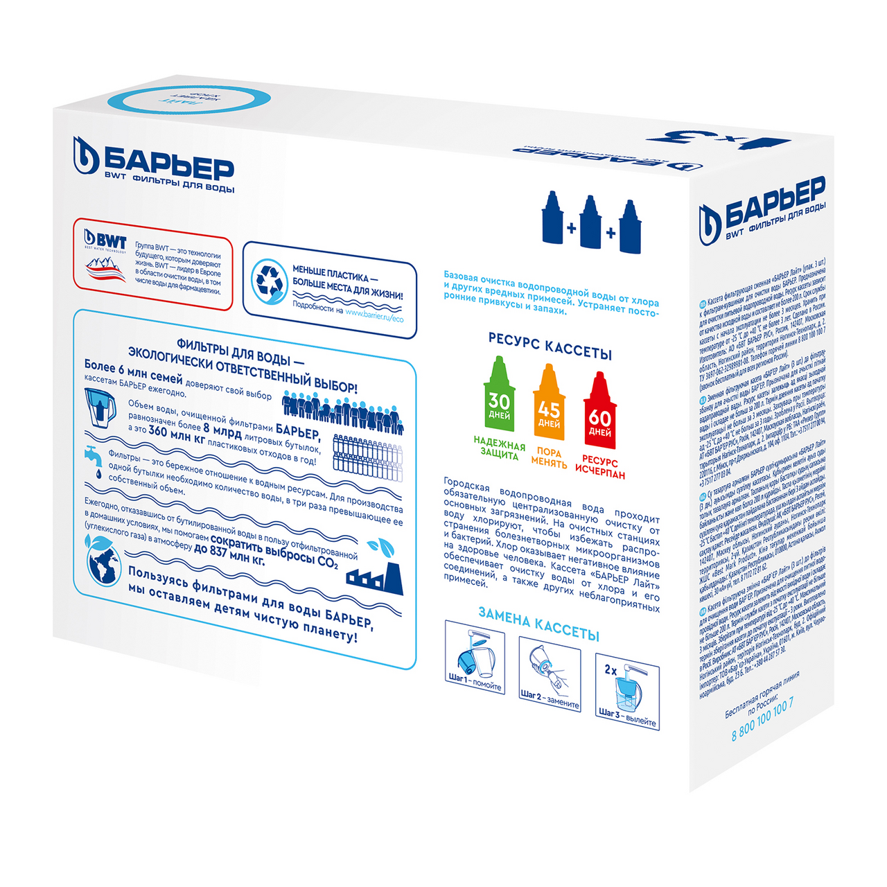 Комплект из 3 сменных кассет для фильтра БАРЬЕР Лайт. Очищает сильно хлорированную городскую воду. Удаляет хлор, тяжелые металлы, посторонние привкусы, запахи и другие вредные примеси. Ресурс каждой кассеты — 200 литров. С фильтрами БАРЬЕР вам не придется запоминать размер или диаметр сменной кассеты: любая кассета БАРЬЕР подходит ко всем фильтрам-кувшинам БАРЬЕР. А герметичное резьбовое соединение исключает попадание неочищенной воды в отфильтрованную.Ресурс зависит от качества исходной воды, но составляет не более 200 литров для каждой кассеты.Использование фильтра-кувшина вместо литровых бутылей на постоянной основе выгоднее в 165 раз и помогает уберечь планету более чем от тонны пластика.