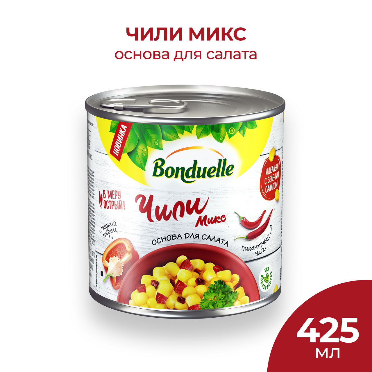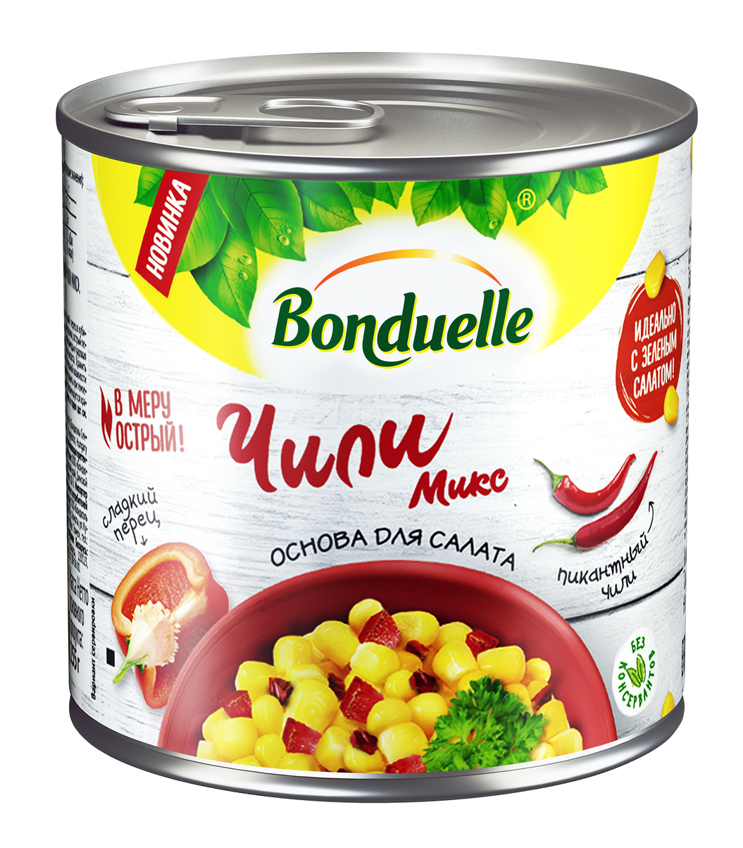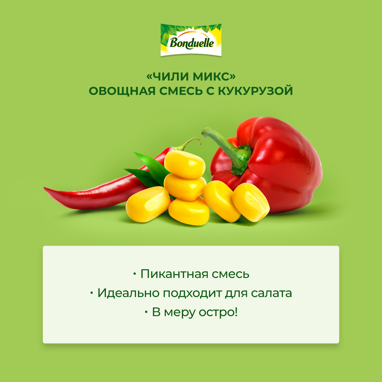 Если вы любите в салатах пикантность, попробуйте овощную смесь с кукурузой Чили Микс. Игра острого и сладкого позволит любому привычному салату зазвучать по-новому. Добавит острых ощущений летом и согреет холодной зимой.