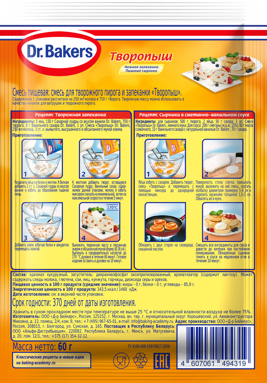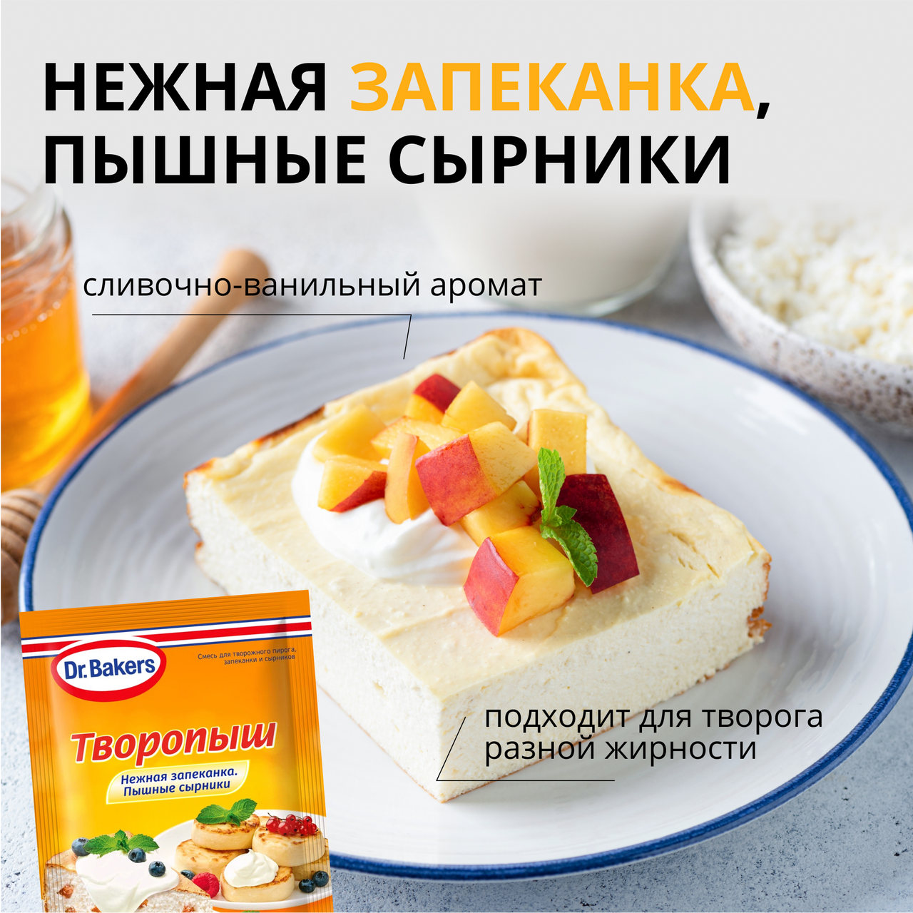Незаменимый помощник для всех, кто хочет приготовить воздушную запеканку или пышный пирог из творога. Для того, чтобы готовые изделия получились нежными, объемными и аппетитными, рекомендуется строго следовать инструкции, представленной на упаковке смеси. Изумительные творожные десерты, приготовленные в домашних условиях, станут прекрасным угощением для ваших близких и друзей. Dr.Bakers предлагает продукты, которые сделают процесс создания тортов, кексов, пирогов и запеканок легким, а получившуюся выпечку – гарантированно удачной.