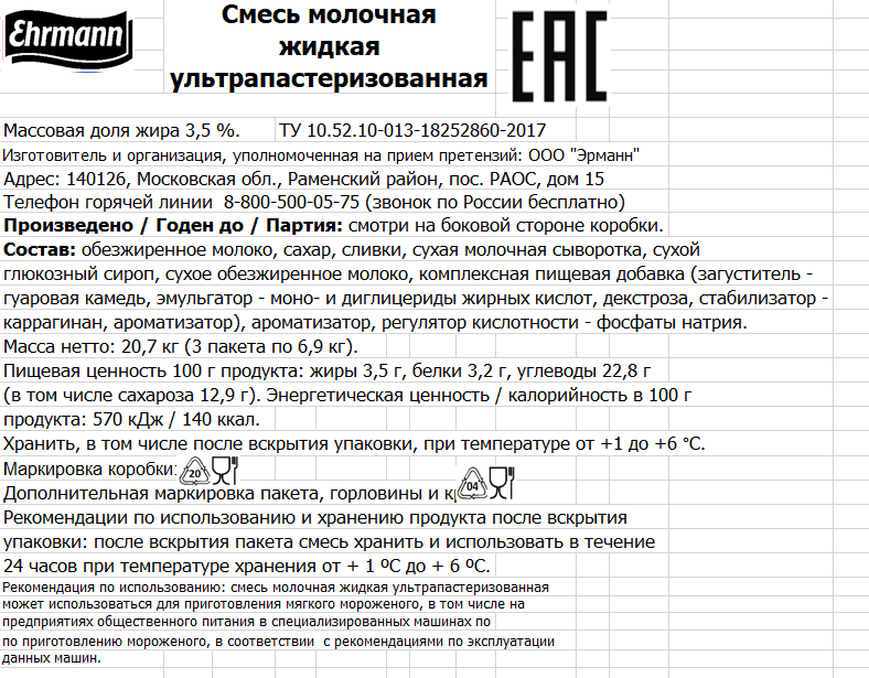 Изготовитель и организация, уполномоченная на приём претензий: ООО Эрманн, 140126, Россия, Московская область, Раменский р-н, пос. РАОС, дом 15. Телефон горячей линии компании: 8 800 500 05 75 (звонок по России бесплатный).ТУ 10.52.10-013-18252860-2017. Рекомендация по использованию: смесь молочная жидкая ультрапастеризованная может использоваться для приготовления мягкого мороженого, в том числе на предприятиях общественного питания в специализированных машинах по приготовлению мороженого, в соответствии с рекомендациями по эксплуатации данных машин.