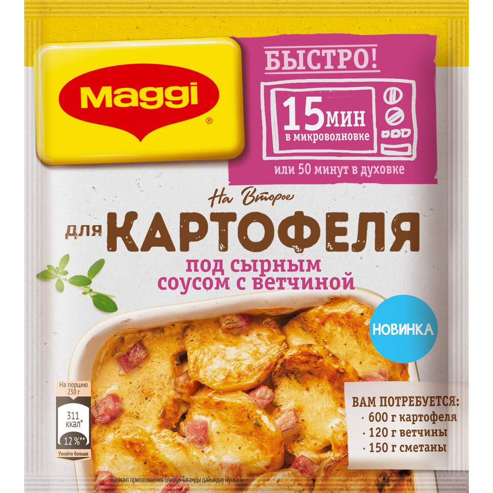 "MAGGI для картофеля под сырным соусом с ветчиной – идеальное решение для быстрой готовки в микроволновке всего за 15 минут. Просто нарежьте картофель кружочками, поставьте в СВЧ на 12-15 минут, затем залейте соусом из MAGGI со сметаной и ветчиной и запекайте еще 3-5 минут.Вы получите полноценное блюдо с нежным и пикантным сливочным соусом, потратив на эту минимум своего времени. К тому же, продукты MAGGI – это только натуральные ингредиенты, без консервантов и искусственных красителей."