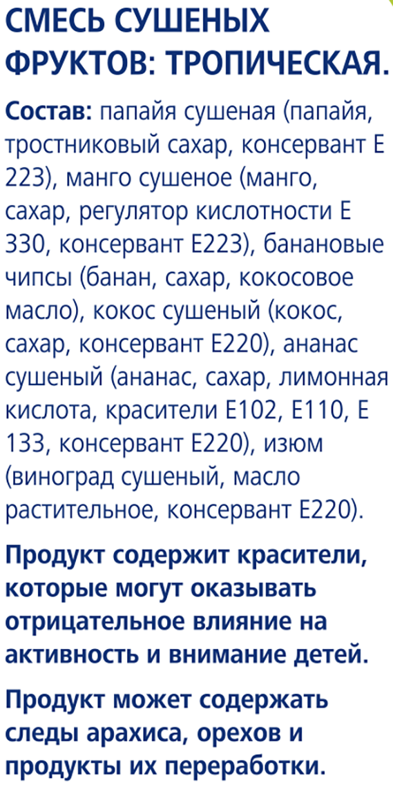 Цукаты папайи (папайя, сахар, регулятор кислотности Е330, консервант Е220), цукаты манго (манго, сахар, регулятор кислотности Е330, консервант Е220), банановые чипсы (бананы, масло растительное, сахар, регулятор кислотности Е330, консервант Е220), цукаты ананаса (ананасы, сахар, регулятор кислотности Е330 консервант Е220, красители: Е102, Е110, Е124, Е133), цукаты кокоса (кокос, сахар, регулятор кислотности Е330, консервант Е220), изюм темный джамбо (виноград сушеный без семян, масло растительное). Продукт может содержать следы арахиса, кунжута и различных видов орехов, продуктов, содержащих сою и глютен.