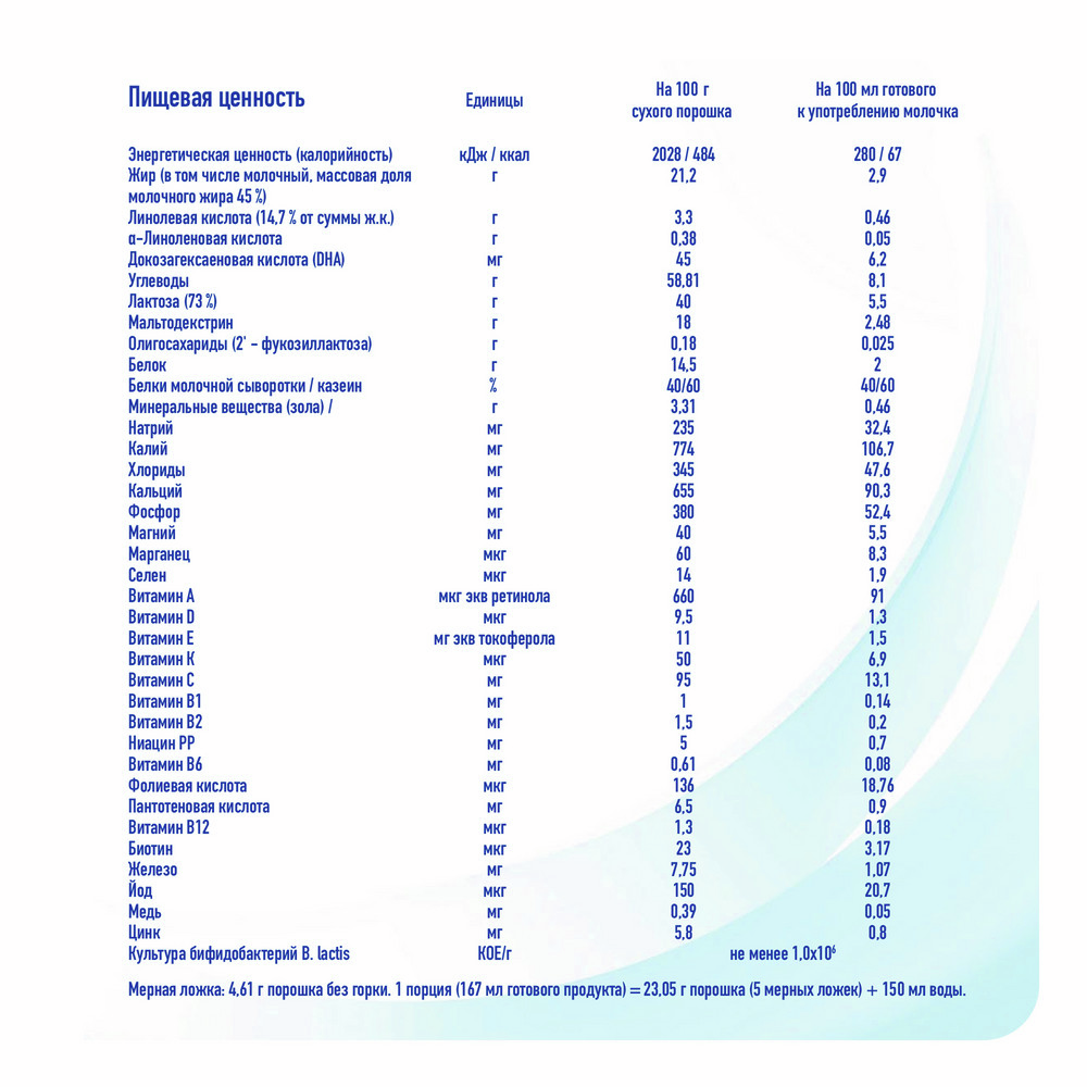 Обезжиренное молоко, молочная сыворотка деминерализованная, мальтодекстрин, растительные масла (низкоэруковое рапсовое, подсолнечное, подсолнечное высоколеиновое, кокосовое), молочный жир, лактоза, кальция цитрат, эмульгатор (соевый лецитин), калия цитрат, витаминно-минеральный премикс (L-аскорбат натрия (С), DL-альфа-токоферол ацетат (Е), кальция D- пантотенат (В5), никотинамид (РР), D-тиамина мононитрат (В1), ретинола ацетат (А), пиридоксина гидрохлорид (В6), йодид калия, фолиевая кислота (В9), рибофлавин (В2), филлохинон (К), D-биотин (В7), селенат натрия, D3 холекальциферол (Д), цианкобаламин (В12), минералы (железа(||) сульфат, сульфат цинка, сульфат меди), калия фосфат, рыбий жир, олигосахариды 2'FL, цитрат натрия, культура бифидобактерий лактис (не менее 1x10⁶ КОЕ/г), регулятор кислотности (гидроксид калия).