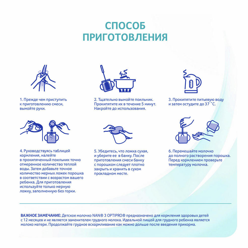 Молочко следует готовить непосредственно перед кормлением. Точно следуйте инструкции по приготовлению. Оставшееся после кормления молочко не подлежит хранению и последующему использованию. Во время кормления необходимо поддерживать ребенка, чтобы он не поперхнулся. Когда ребенок подрастет, переходите на кормление из чашки.