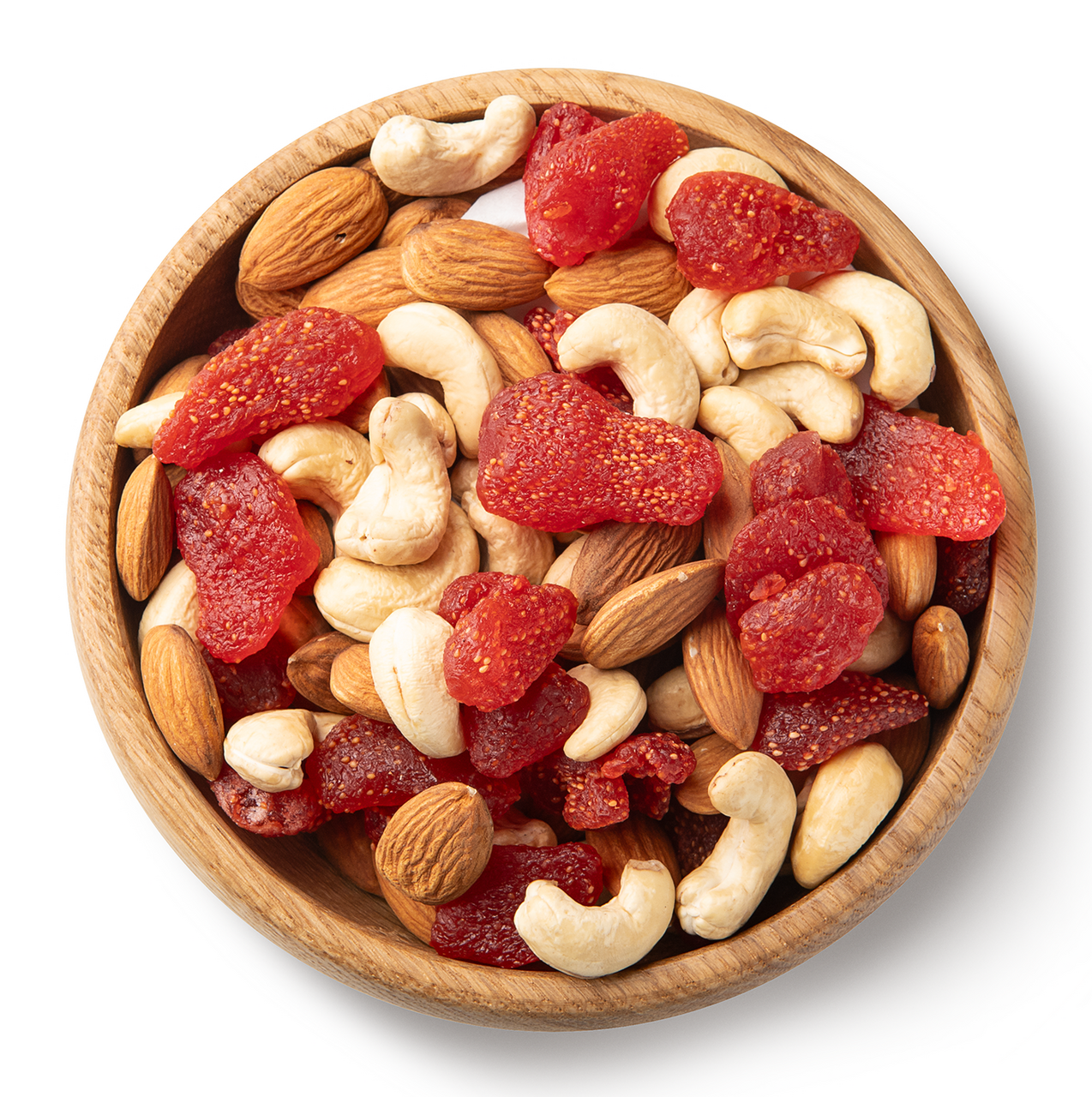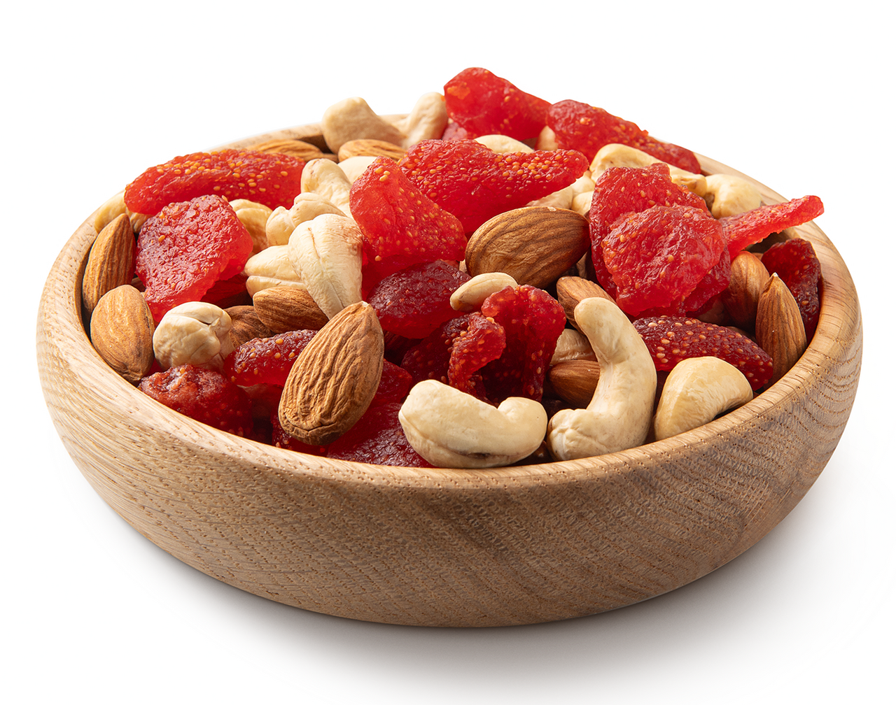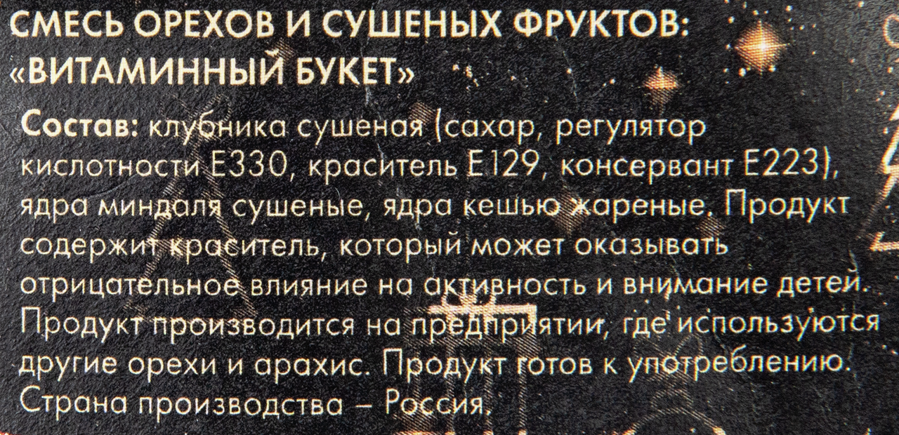 Клубника сушеная сахар, регулятор кислотности, Е330, краситель Е129, консервант Е223, ядра миндаля сушеные, ядра кешью жареные.