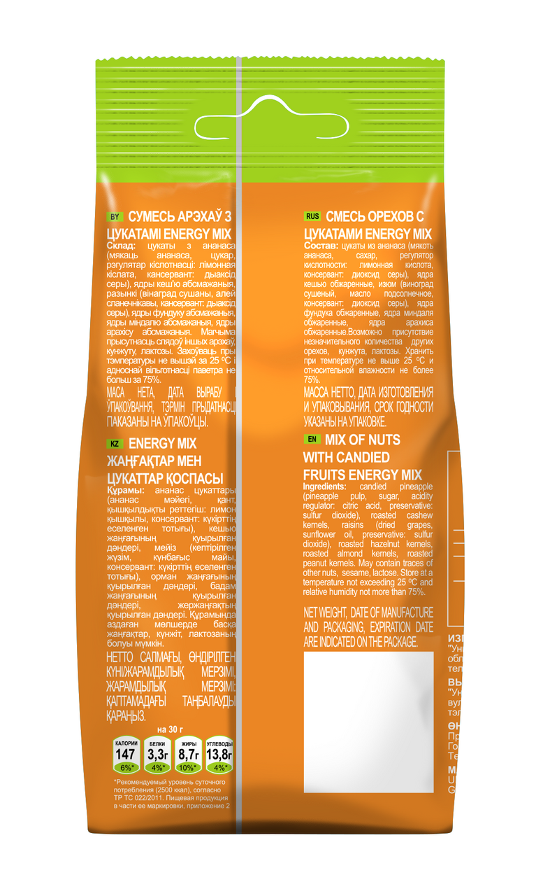Цукаты из спелого ананаса, изюм в сочетании с обжаренными ядрами миндаля, фундука, кешью и арахиса в удобной упаковке.Идеальное решение для полезного и питательного перекуса или для приготовления десертов.Цукаты из ананаса природные антидепрессанты, прекрасно поднимают настроение и дарят улыбку. Орехи прекрасный источник полезных ненасыщенных жиров, клетчатки, витаминов и минералов.Микс удобно взять с собой на работу, учебу или в поездку