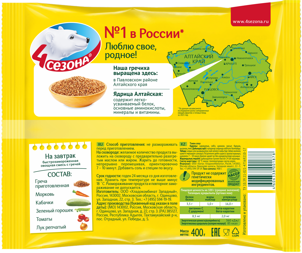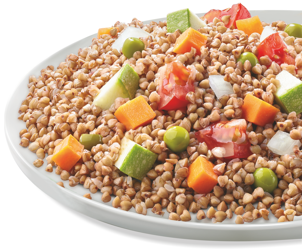 Гречневая каша с морковью, кабачками, зеленым горошком, томатами и луком.На приготовление легкого, но сытного блюда понадобится всего 8-10 минут.Несомненным преимуществом быстрозамороженной смеси является то, что она, подвергаясь глубокой шоковой заморозке, на 95% сохраняет полезные свойства свежего продукта, проста в приготовлении и так же вкусна. При применении этой технологии не требуется никаких дополнительных, вредных для здоровья потребителя химических добавок