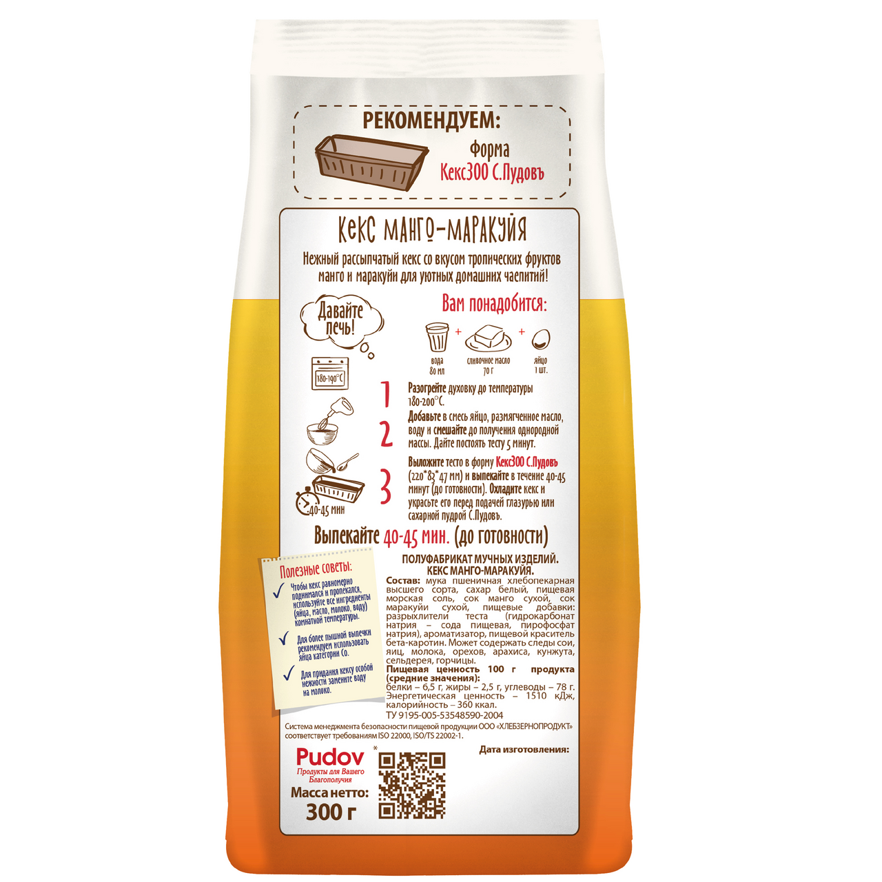 Готовая смесь для выпечки Кекс манго-маракуйя поможет без лишних усилий приготовить вкусный и нежный кекс с приятным вкусом и ароматом тропических фруктов. Мучную смесь для выпечки кекса разработали таким образом, чтобы вам оставалось добавить в неё только воду, яйцо и масло. Тесто для кекса замешивается легко и быстро. Готовый рассыпчатый кекс с хрустящей корочкой идеально подойдёт для домашнего чаепития или скромного торжества. Для праздничной подачи готовый кекс рекомендуется покрыть сахарной глазурью и кондитерскими посыпками С.Пудовъ. Для наилучшего результата можно использовать при выпекании кекса специальную форму Кекс300 от С.Пудовъ. Она разработана таким образом, чтобы десерт пропекался равномерно, не терял форму и сохранил свой классический вид.