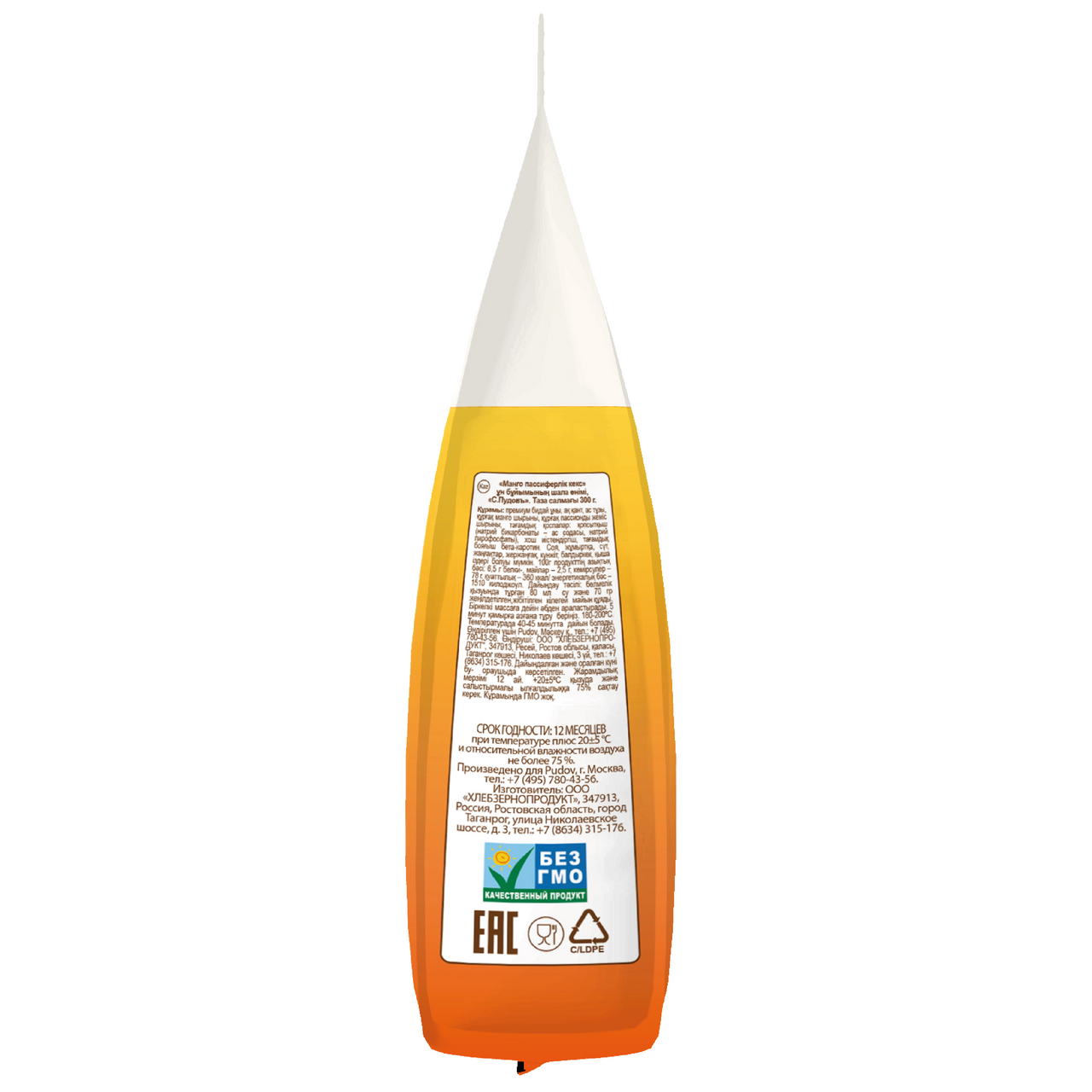 Мука пшеничная хлебопекарная высшего сорта, сахар белый, пищевая морская соль, сок манго сухой, сок маракуйи сухой, разрыхлители теста (гидрокарбонат натрия – сода пищевая, пирофосфат натрия), ароматизатор, пищевой краситель бета-каротин.