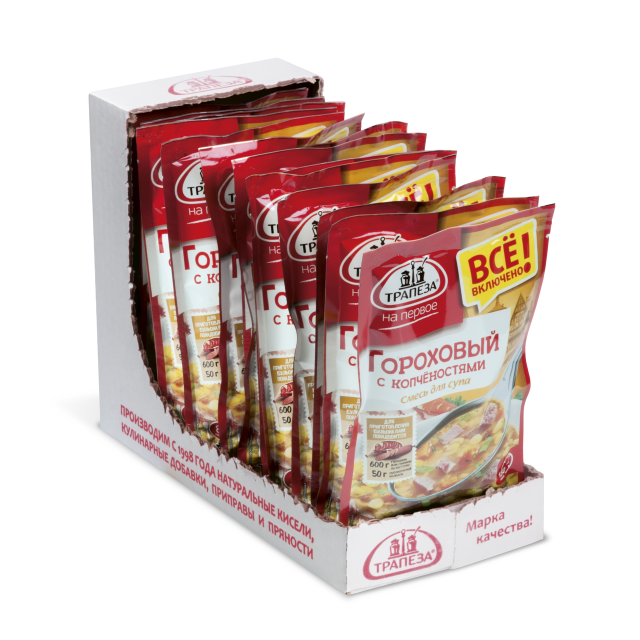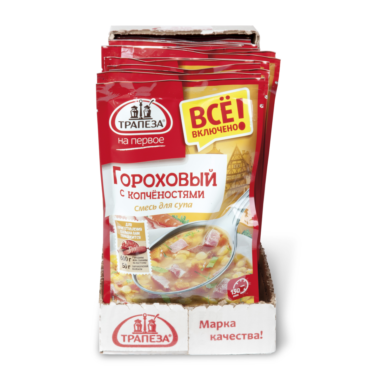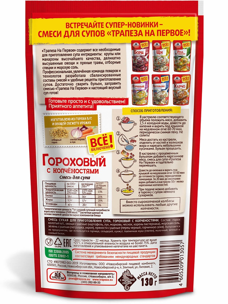 Смесь сухая для приготовления супа. Гороховый с копченостями. Рецепт супа создан по мотивам традиционной немецкой гороховой похлебки с копчёной колбасой. Включает только натуральные ингредиенты. В ее составе деликатно высушенные овощи и травы, крупы или макароны высочайшего качества, отборные пряности и специи, настоящая морская соль. Нет экстрактов, нет усилителей вкуса, нет ароматизаторов, нет растительных жиров, нет соевых белков.