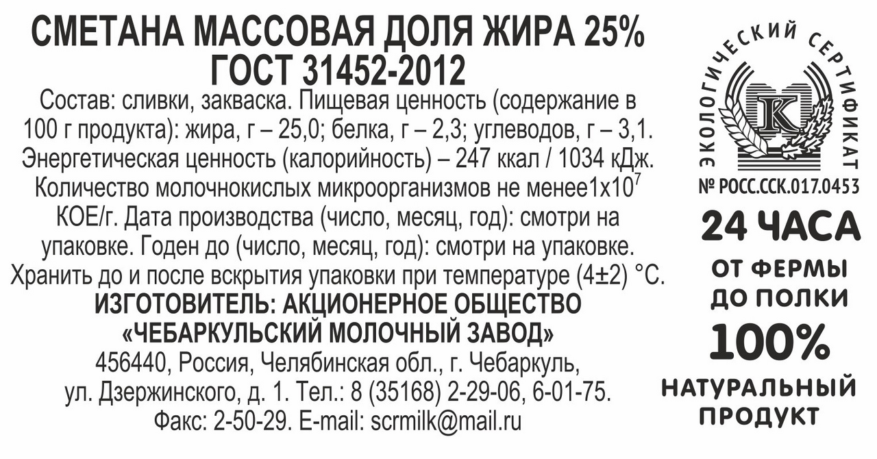 Сметана Чебаркульское молоко ГОСТ 25%, 320г отличается традиционной плотностью и густотой, насыщенным сливочным вкусом и кисломолочным ярким ароматом. Сметана широко применяется для заправки как овощных, так и сложных сборных салатов, в качестве основы для соусов и подлив. Она традиционно подается к блинам, пельменям и первым блюдам. Используют ее и в специальном питании, как заживляющее средство при солнечных ожогах кожи.