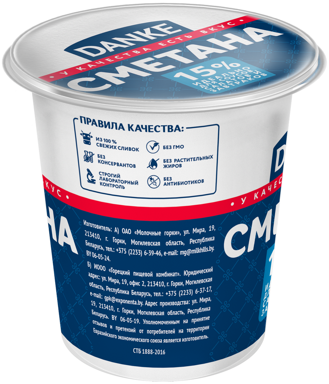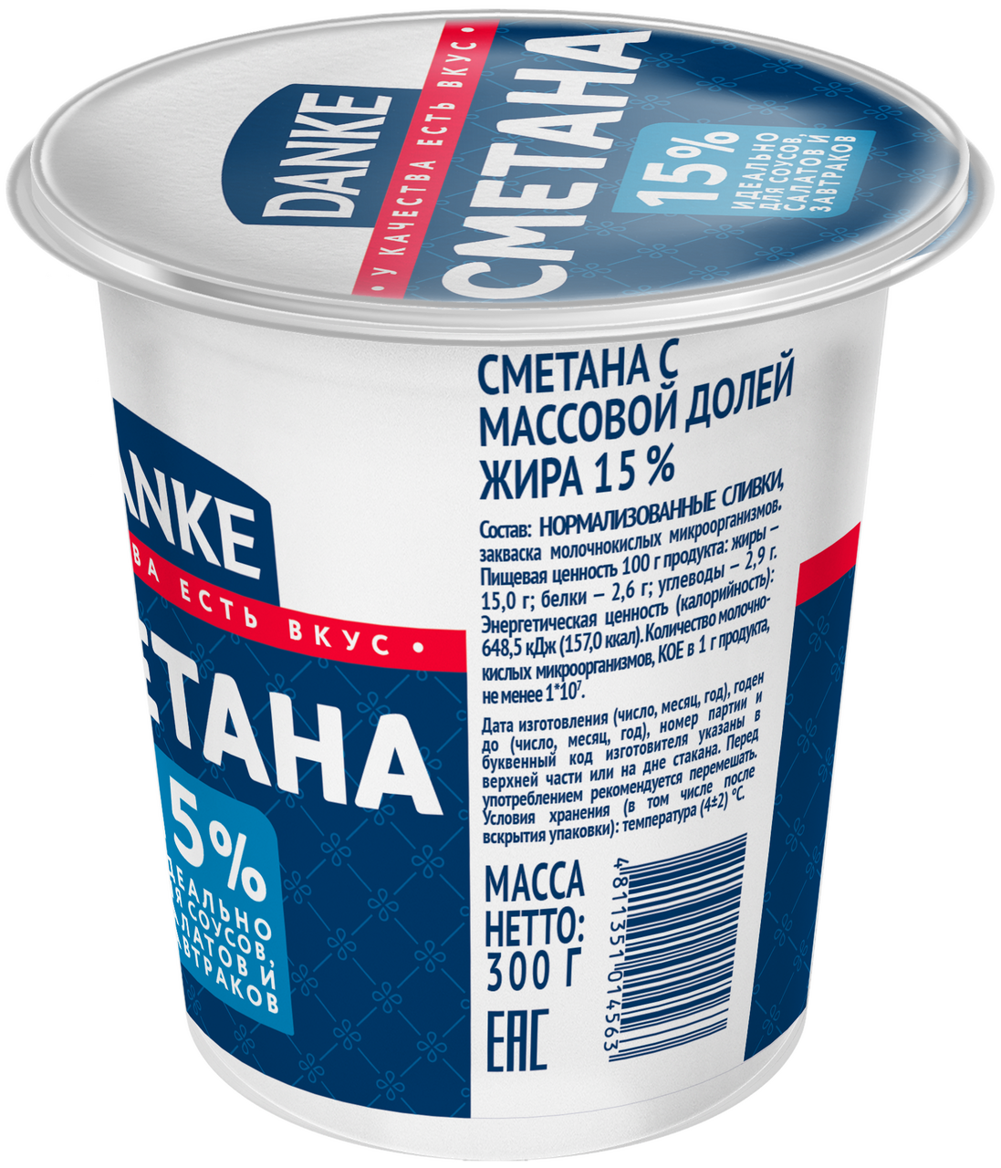 Сметана Danke 15% – натуральный кисломолочный продукт, приготавливаемый по классической технологии из сливок и живой закваски. Не содержит антибиотиков, консервантов и растительных жиров. Натуральный продукт для всей семьи. Сметана содержит необходимые витамины, а также макро и микроэлементы, органические кислоты. Благодаря высокому содержанию кальция, она полезна для укрепления и роста костей. Кроме того, польза сметаны в том, что в ней содержится лецитин, способствующий растворению холестерина. Можно добавлять ее в любые блюда не только в качестве ингредиента, но и как дополнение к горячим и холодным супам, а также драникам и сырникам.