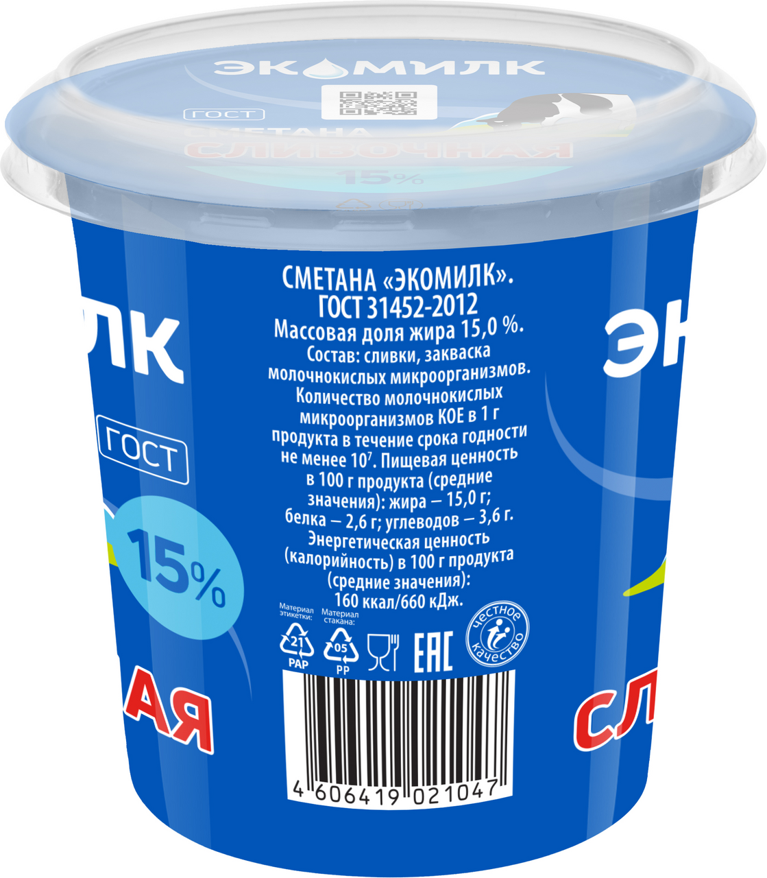 Сметана Экомилк сливочная ГОСТ 15%, 300г