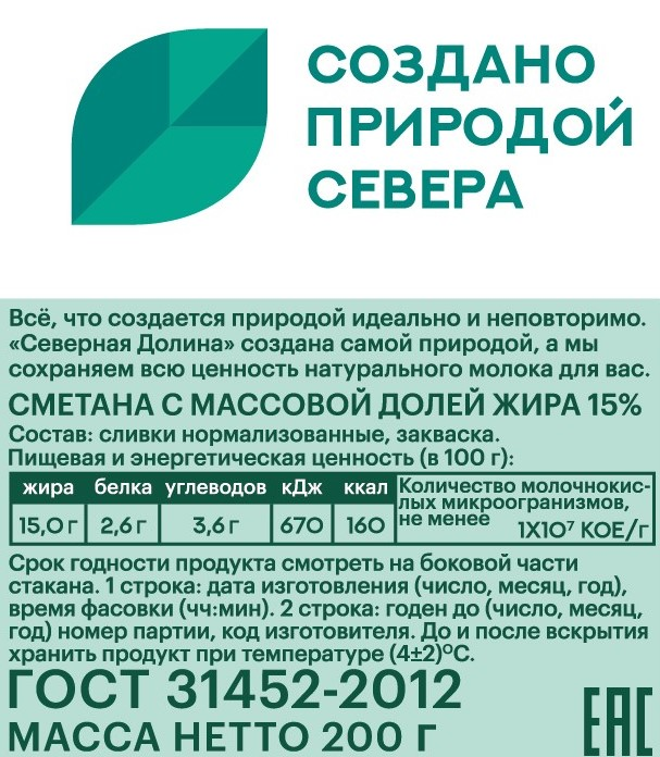 Сметана Северная долина 15%, 200г