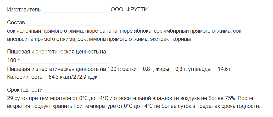 В состав напитка входит сок яблочный прямого отжима, пюре банана, пюре яблока, сок имбирный прямого отжима, сок апельсина прямого отжима, сок лимона прямого отжима, экстракт корицы. Все ингредиенты взбиты до однородной консистенции, поэтому текстура у смузи нежная и бархатистая. Такой объем вмещает в себя 13% суточной нормы пищевых волокон, которые должны поступать в организм человека с фруктами. Это легкий, вкусный, правильный перекус, который подарит бодрость и хорошее настроение. Продукт не содержит концентратов, консервантов и сахара.