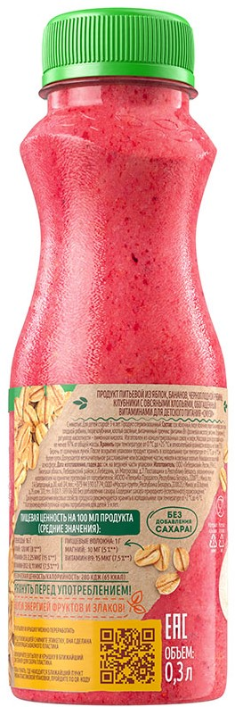 Сок яблочный, пюре яблочное, пюре банановое, сок из черноплодной рябины, пюре клубники, хлопья овсяные, витаминный премикс (витамин B9 (фолиевая кислота), витамин D3, витамин B12), регулятор кислотности – лимонная кислота.