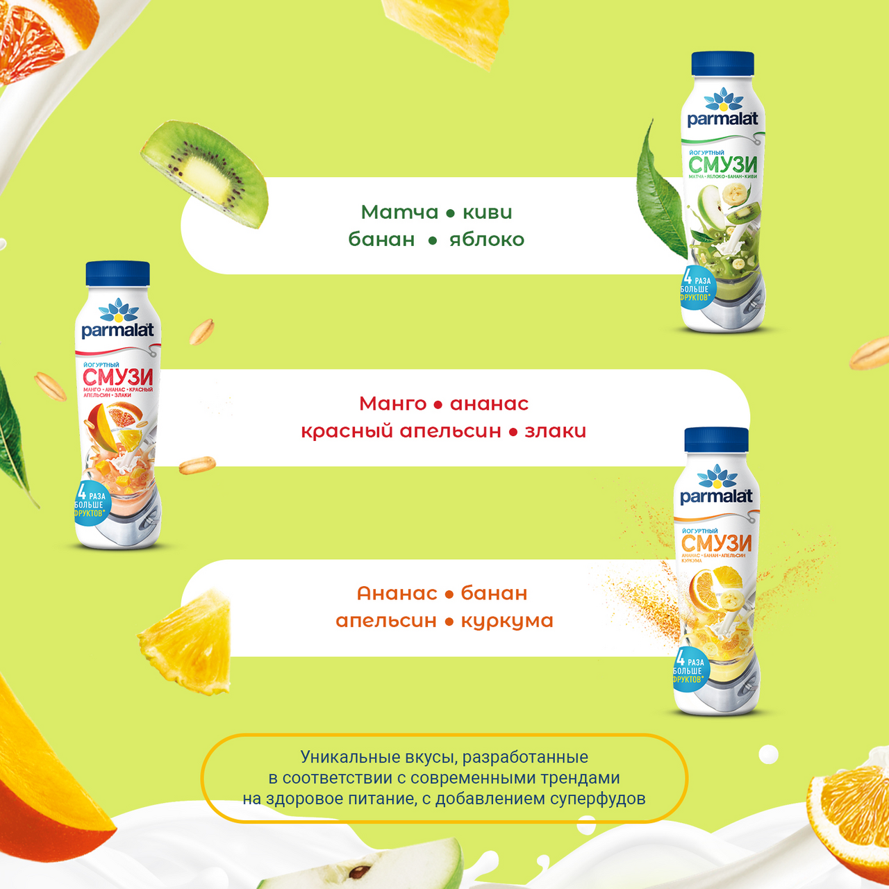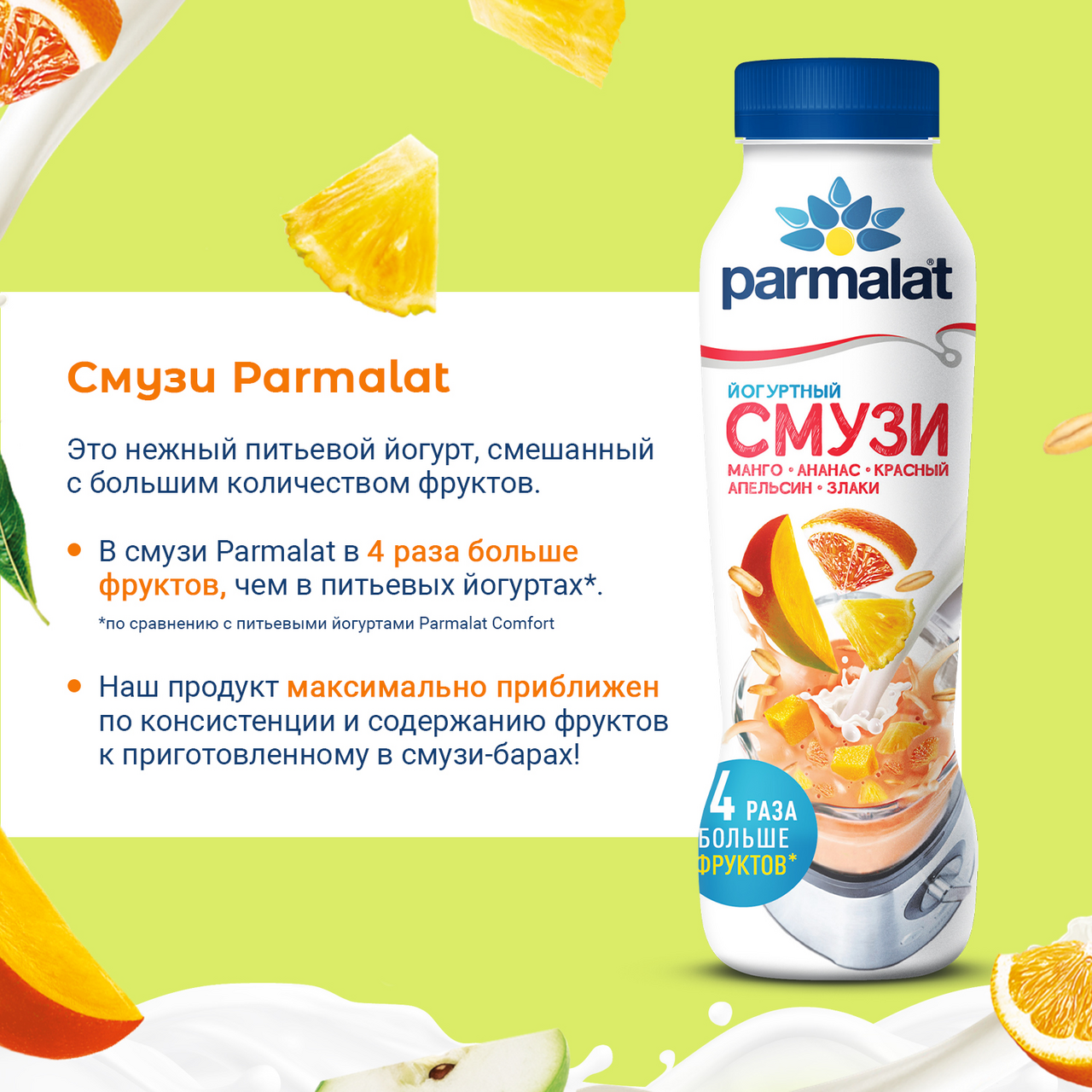 Смузи йогуртный Parmalat манго, ананас, апельсин и злаки, 280г БЗМЖ легко усваиваются, потому что произведены из безлактозного молока. Они не содержат лактозы – молочного сахара, который может провоцировать тяжесть и неприятные ощущения во время пищеварения.