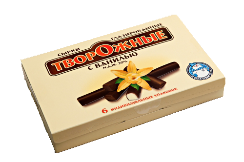 Творог, сахар-песок, кондитерская глазурь (сахар, заменитель масла какао нетемперируемый лауринового типа (фракционированное, гидрогенизированное пальмоядровое масло), какао-порошок, эмульгатор лецитин соевый, ароматизатор Ванилин), сливочное масло, ароматизатор Ванилин.