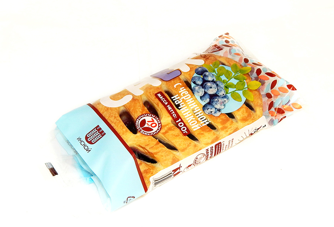 Выпечен из невесомого слоеного теста, которое отличается воздушной, рыхлой консистенцией и румяной корочкой. Обильно начинен черничным конфитюром. Подается к чаю или кофе.