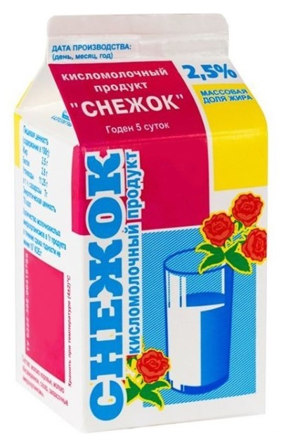 Кисломолочный напиток, производимый по специальной технологии из натурального пастеризованного молока, закваски, в составе которой присутствуют чистые культуры микроорганизмов, с добавлением сахара. Снежок содержит витамины А, С, D, H, PP, группы В, кальций, фосфор, калий. Продукт улучшает работу желудка, помогает организму восстанавливаться после болезни, обладает антиоксидантными свойствами. Его употребляют отдельно. Также применяют для приготовления разнообразной домашней выпечки.