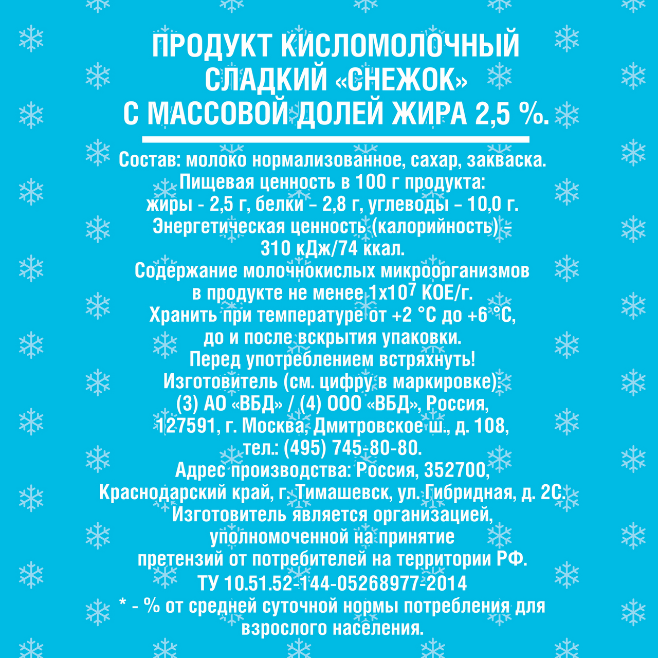 Снежок Кубанская буренка 2,5% - вкусный, натуральный продукт на каждый день, созданный на основе топленого молока и закваски. Снежок отлично сочетается с кондитерскими изделиями, домашней выпечкой, фруктами и ягодами. Напиток позволяет создавать простые и в то же время оригинальные десерты. Картонная упаковка сохраняет свежесть продукта, густую, однородную консистенцию и полезные свойства. Благодаря ее компактному формату можно брать снежок с собой на работу, учебу или в поездку.
