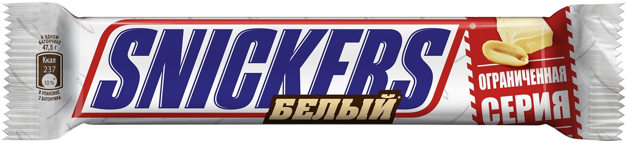 Шоколадный батончик Snickers "Белый" с начинкой из жареного арахиса, карамели и нуги, покрытый белым шоколадом. Батончик Snickers идеально подходит для людей, ведущих активный образ жизни, и тех кто любит проводить время в компании друзей. Ты – не ты, когда голоден. Не тормози, Сникерсни!