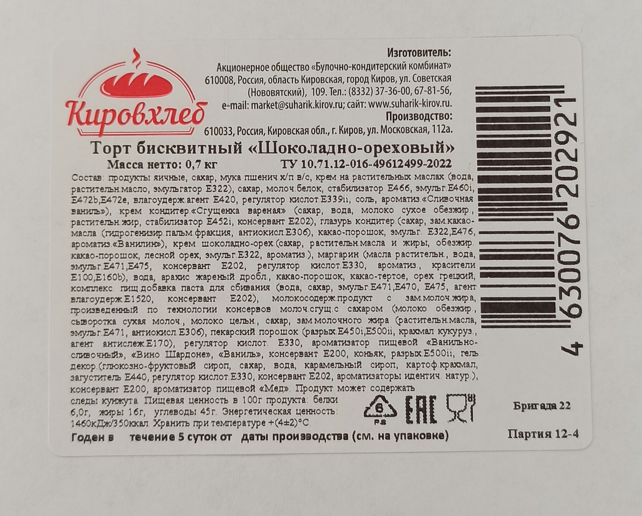 Торт БКК Шоколадно-ореховый, 700г — это нежное бисквитное тесто со сладкой начинкой с добавлением вареного сгущенного молока и арахиса. Сверху торт декорирован слоем шоколадной глазури и мелкой ореховой россыпью. Угощение прекрасно дополнит чашечку свежесваренного кофе или ароматного чая.