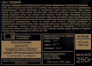 Лапша отварная вода питьевая, мука пшеничная, мука гречневая, масло подсолнечное рафинированное дезодорированное, говядина произведено из замороженного сырья, перец сладкий, лук репчатый, кабачок, соус соевый вода питьевая, соевые бобы, пшеница, соль пищевая, сахар-песок, соус сладкий Чили сахар-песок, вода питьевая, перец чили, соль пищевая, чеснок, загуститель крахмал кукурузный, регулятор кислотности уксусная кислота, стабилизатор ксантановая камедь, имбирь, чеснок, масло подсолнечное рафинированное дезодорированное, специи.