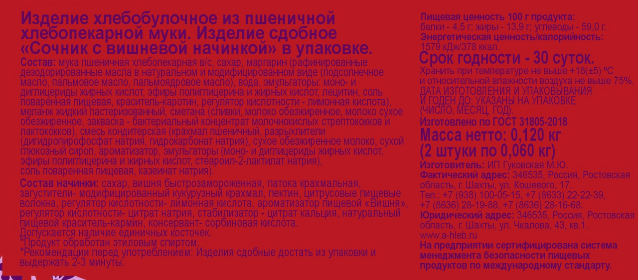 Сочник Аютинский хлеб с вишней (60г x 2шт), 120г