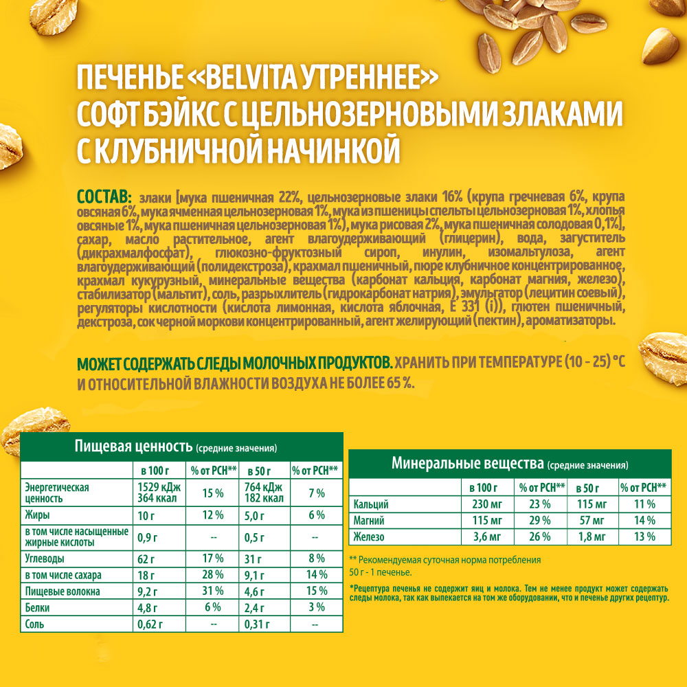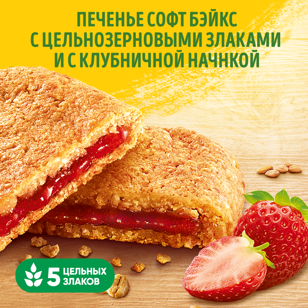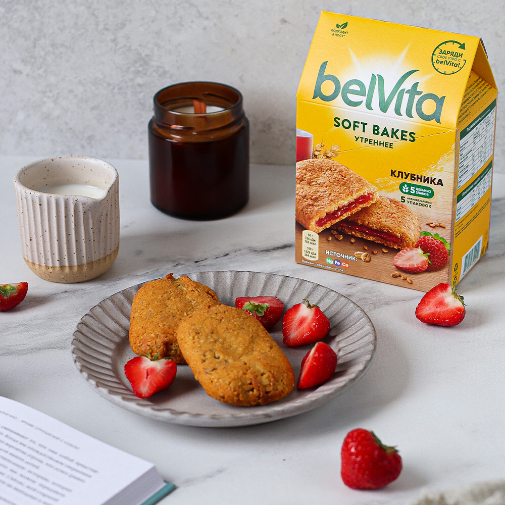Печенье "belVita Утреннее" Софт Бэйкс с цельнозерновыми злаками с клубничной начинкой - мягкое печенье с 5ю цельными злаками (овес, пшеница, греча, ячмень, полба) и нежной начинкой. Источник магния, кальция и железа. Печенье злаковое - идеально для утра и делает завтрак еще вкуснее и питательнее, просто добавьте йогурт, творог, фрукт. Полезное печенье с начинкой belVita в составе сбалансированного перекуса – это то, что позволит зарядить положительной энергией, бодростью и оптимизмом. Печенье с начинкой является альтернативой круассанам, пряникам, сладким крекерам, кексам и другой выпечке; отлично подходит к чаю и к кофе, вкусно с молоком, кефиром, ряженкой, соком, какао и другими напитками. Печенье в индивидуальной упаковке удобно взять с собой на работу или на прогулку, в поездку, на пикник или на дачу. Не содержит продуктов животного происхождения, поэтому подходит в пост.