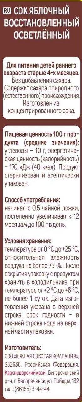 Готовый продукт к употреблению, легкий перекус. Детский сок из яблок имеет высокий стандарт качества и сертифицирован по системе эко-продукт. Натуральный сок можно взять с собой в детский сад, на прогулку, в школу или путешествия.