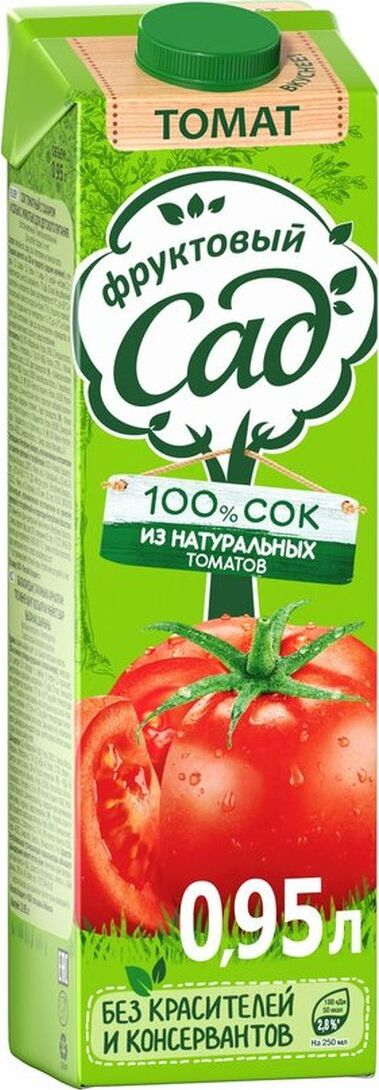 100% томатный сок Фруктовый садпродолжает радовать нас отменным вкусом, ноуже по-новому. Теперь вкус иаромат спелых томатов стали еще более насыщенными. Попробуйте сами!● 100% Сок. Из натуральных томатов. ● Без красителей и консервантов● Бархатная текстура илегкая cолоноватость вовкусе● Идеально подойдет для насыщенных семейных выходных... идля будней тоже● В 1 стакане "Фруктового сада" содержится сок из 3 томатов и 48% от суточной нормы бета-каротина Фруктовый Cад – это один из крупнейших брендов соковой категории в России. Ассортимент представлен широкой линейкой соков и нектаров из фруктов и ягод для всей семьи, а также традиционными для России натуральными морсами и компотами.