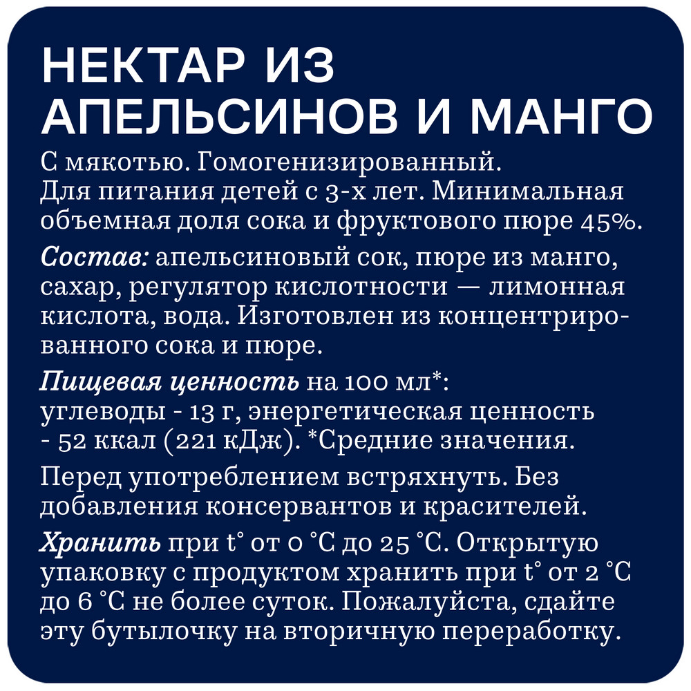 Апельсиновый сок, пюре из манго, сахар, регулятор кислотности - лимонная кислота, вода. Изготовлен из концентрированного сока и пюре.