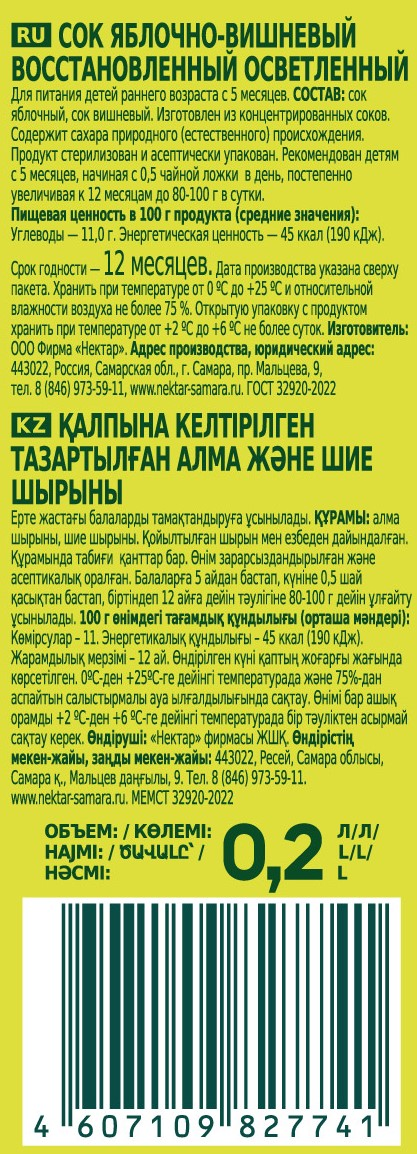 Сок Яблочно-вишневый восстановленный осветленный. Для питания детей раннего возраста (С 5 месяцев). Изготовлен из натуральных отборных фруктов, которые обеспечат малыша природной пользой и энергией для гармоничного роста и развития. Сок полезен для укрепления иммунной и сердечно-сосудистой системы. Способствует укреплению сна и улучшению настроения.