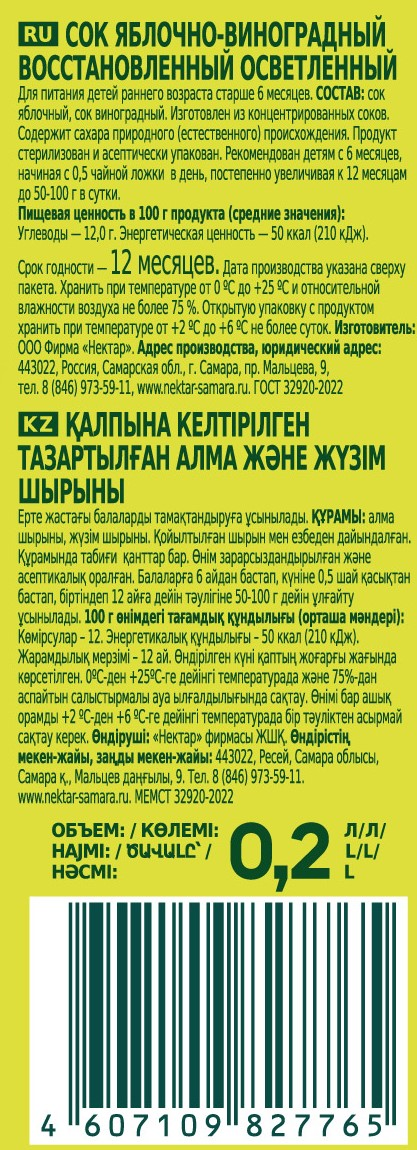 Сок яблочно-виноградный восстановленный осветленный. Для питания детей раннего возраста (С 6 месяцев). Виноград - сильнейший природный антиоксидант, он снимает усталость и нервное напряжение. В сочетании с яблоками нашего урожая он быстро восстанавливает силы, укрепляет иммунитет и защищает организм.