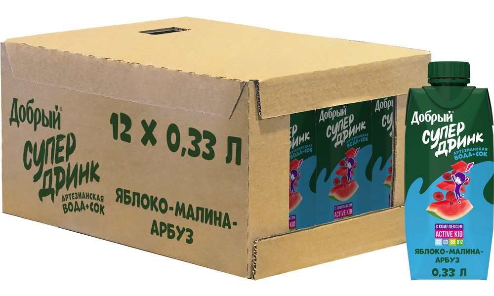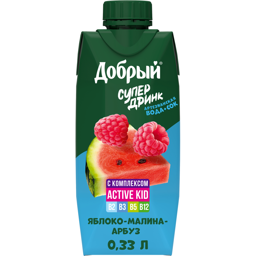 Напиток сокосодержащий Добрый Active kid из яблок, малины и арбуза, обогащенный витаминным комплексом, 330мл