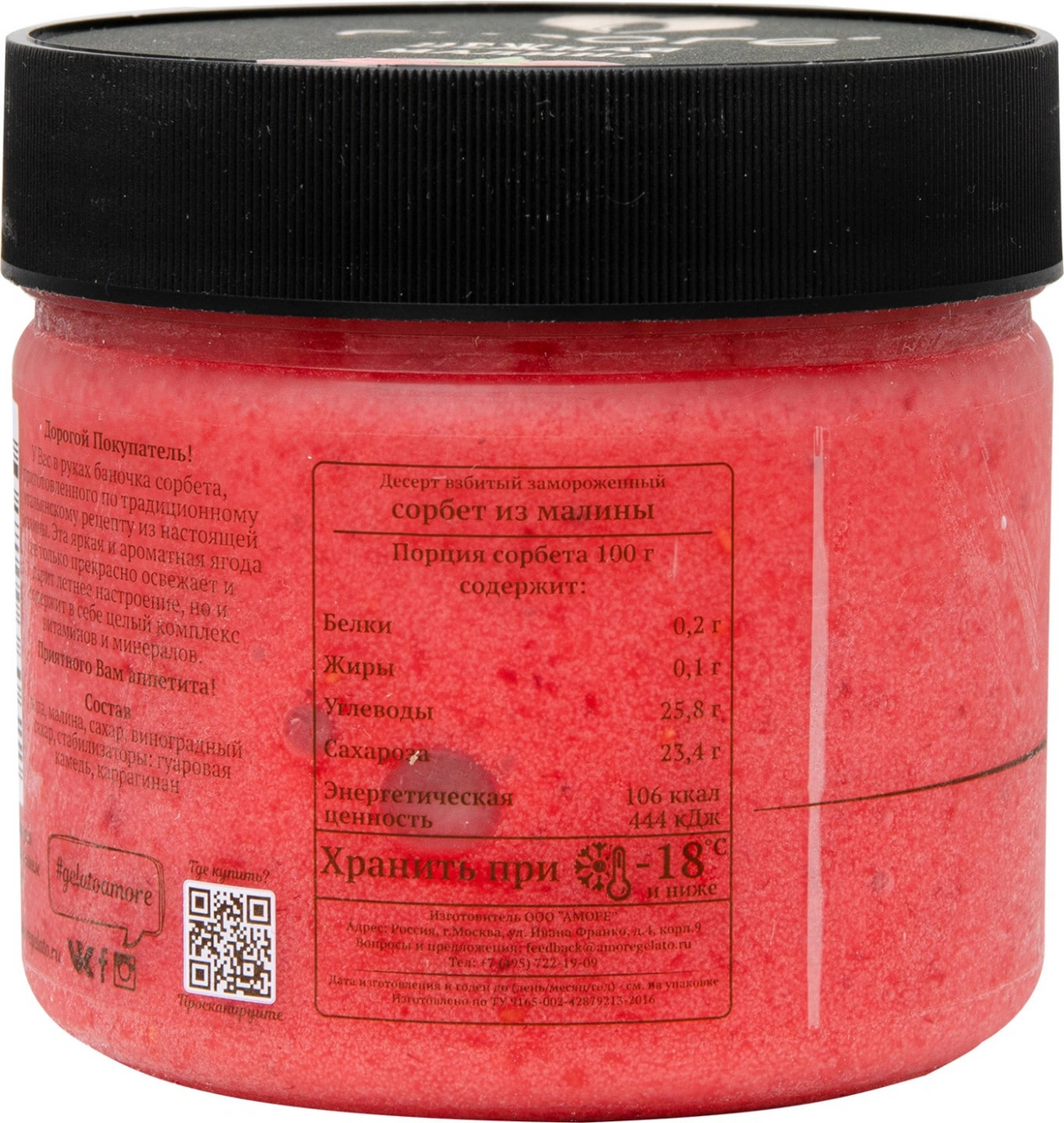 Дорогой покупатель, предлагаем Вам сорбет "Нежная Малина", приготовленного по традиционному итальянскому рецепту из настоящей малины. Эта яркая и ароматная ягода не только прекрасно освежает и дарит летнее настроение, но и содержит в себе целый комплекс витаминов и минералов. Приятного Вам аппетита!