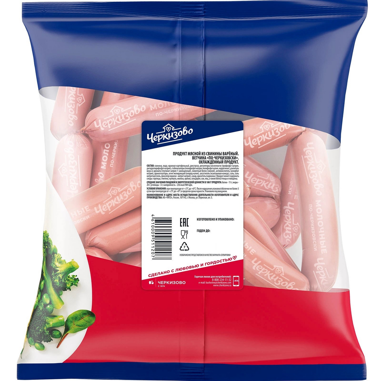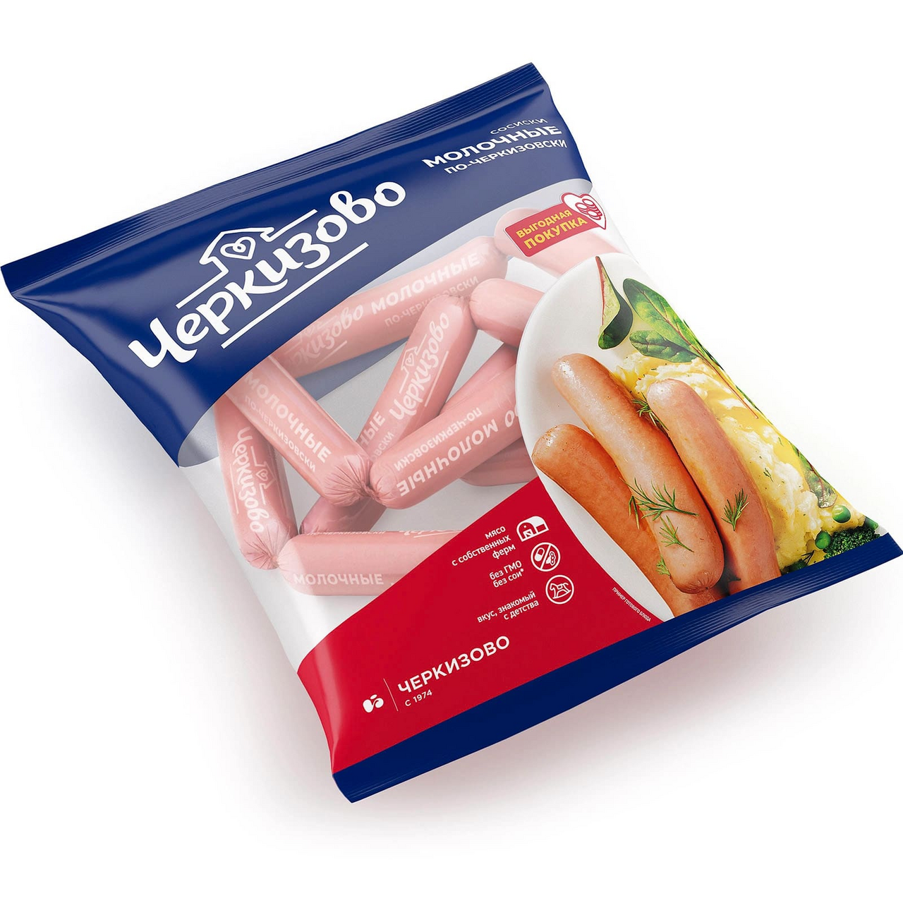 Сосиски Молочные по-черкизовски – питательный мясной продукт, который изготовлен по традиционному рецепту с использованием отборной говядины и свинины. В составе отсутствуют генно-модифицированные компоненты и вредные добавки. Сосиски отличаются неповторимым вкусом и притягательным сливочным ароматом. Имеют однородную структуру без добавления шпика. При варке не развариваются и не окрашивают воду в розовый цвет.