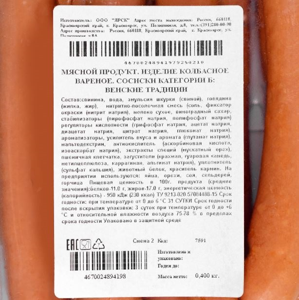 Свинина, вода, эмульсия шкурки свиной, говядина жилка, жир, нитритно-посолочная смесь соль, фиксатор окраски нитрит натрия, молоко сухое, виноградный сахар, стабилизаторы пирофосфат натрия, полифосфат натрия регуляторы кислотности трифосфат натрия, ацетат натрия, диацетат натрия, цитрат натрия, глюконат натрия, ароматизаторы, усилитель вкуса и аромата глутамат натрия, мальтодекстрин, антиокислитель аскорбиновая кислота, изоаскорбат натрия, экстракты специй мускатный орех, пшеничная клетчатка, загустители крахмал, гуаровая камедь, метилцеллюлоза, каррагинан, альгинат натрия, уплотнитель сульфат кальция, животный белок, краситель кармин.