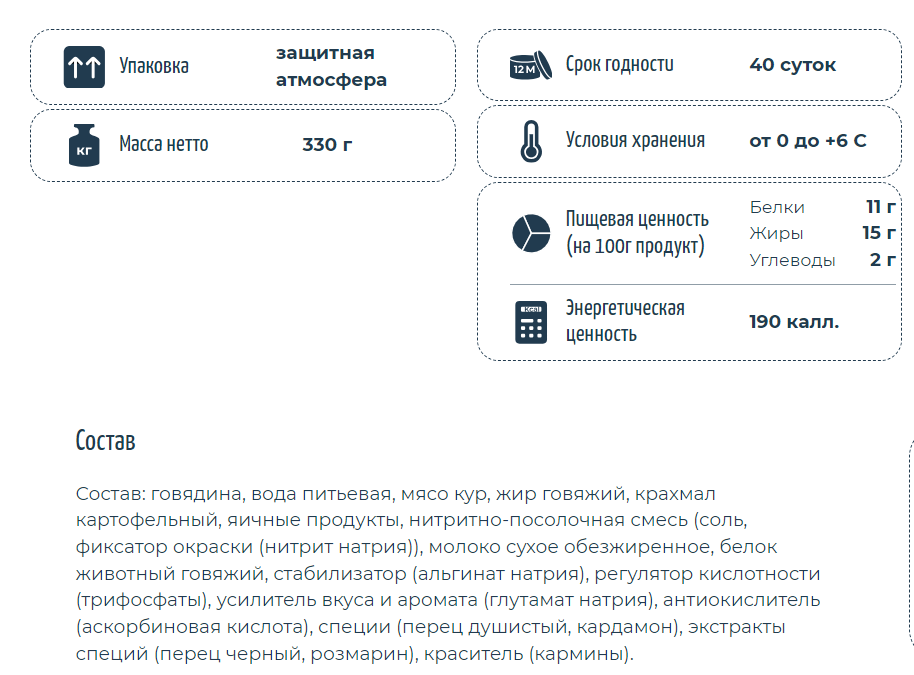 Говядина, вода питьевая, мясо кур, жир говяжий, крахмал картофельный, яичные продукты, нитритно-посолочная смесь соль, фиксатор окраски нитрит натрия, молоко сухое обезжиренное, белок животный говяжий, стабилизатор альгинат натрия, регулятор кислотности трифосфаты, усилитель вкуса и аромата глутамат натрия, антиокислитель аскорбиновая кислота, специи перец душистый, кардамон, экстракты специй перец черный, розмарин, краситель кармины.